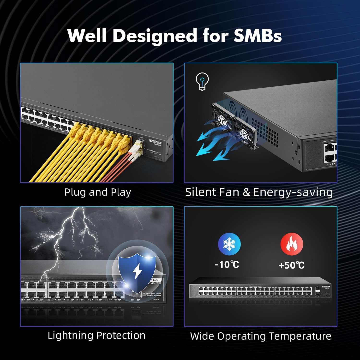 - 【50 Gigabit Ports】The switch includes 48 Gigabit POE+ ports, 2 Gigabit SFP UpLink, can be more flexible and long distance to connect to different network devices, such as routers, switches, servers, etc.