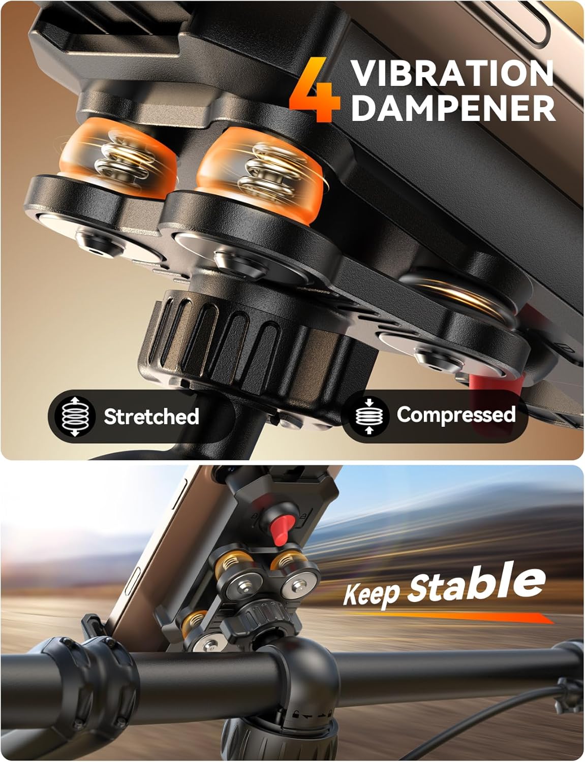 - [Why Vibration Dampening] JOYROOM bike phone holder mount features an pneumatic shock-absorbing springs and telescopic anti-shake system that effectively cushions up to 80% of the vibration, keeping your phone stable even when riding on bumpy roads. Our bike phone holder handlebar makes your cycling trip safer and more secure!