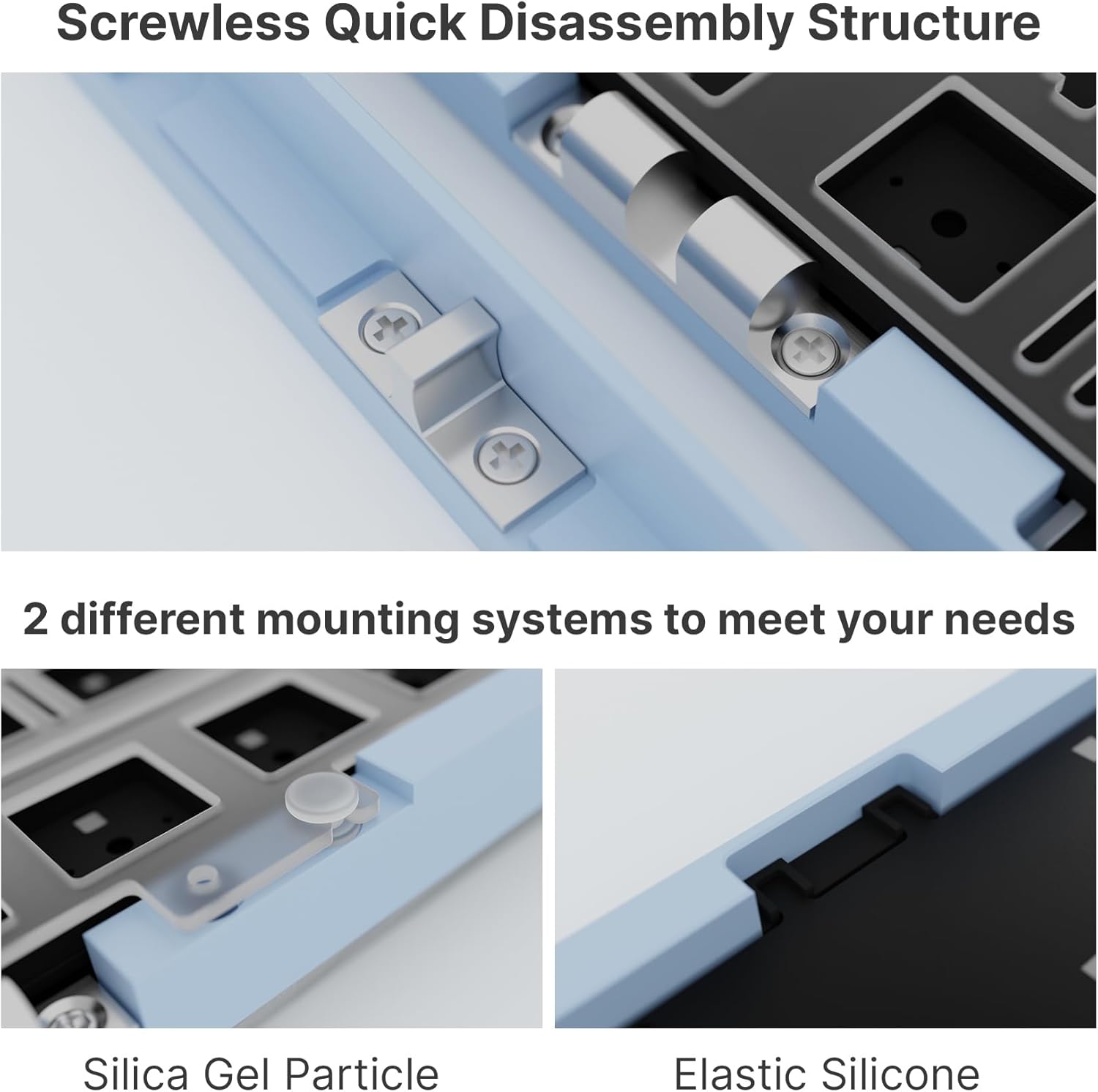 - Quickly Disassembled & 2 Mounting Systems: The ND TKL 80% percent keyboard adopts screwless quick assembly structure, using the ball catch system, Can be quickly and easily disassembled and assembled. 2 Mounting Systems: Silica Gel Particle Mount, Elastic Silicone Mount. 2 different mounting systems give you a different typing experience