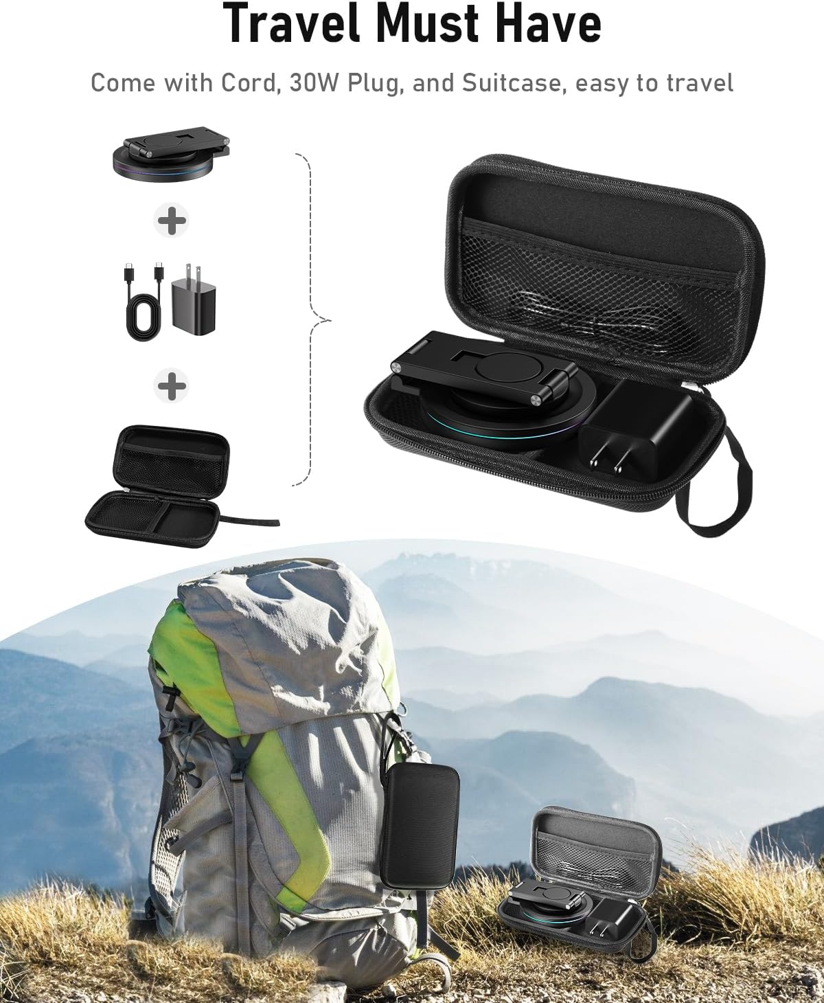 - 360° Adjustable Charging Stand – Perfect Viewing Angle:One-handed rotation with smooth multi-angle tilt. Crisp mechanical feedback ensures precise control for work, video calls, or binge-watching.Foldable design saves desk space while maintaining stability.