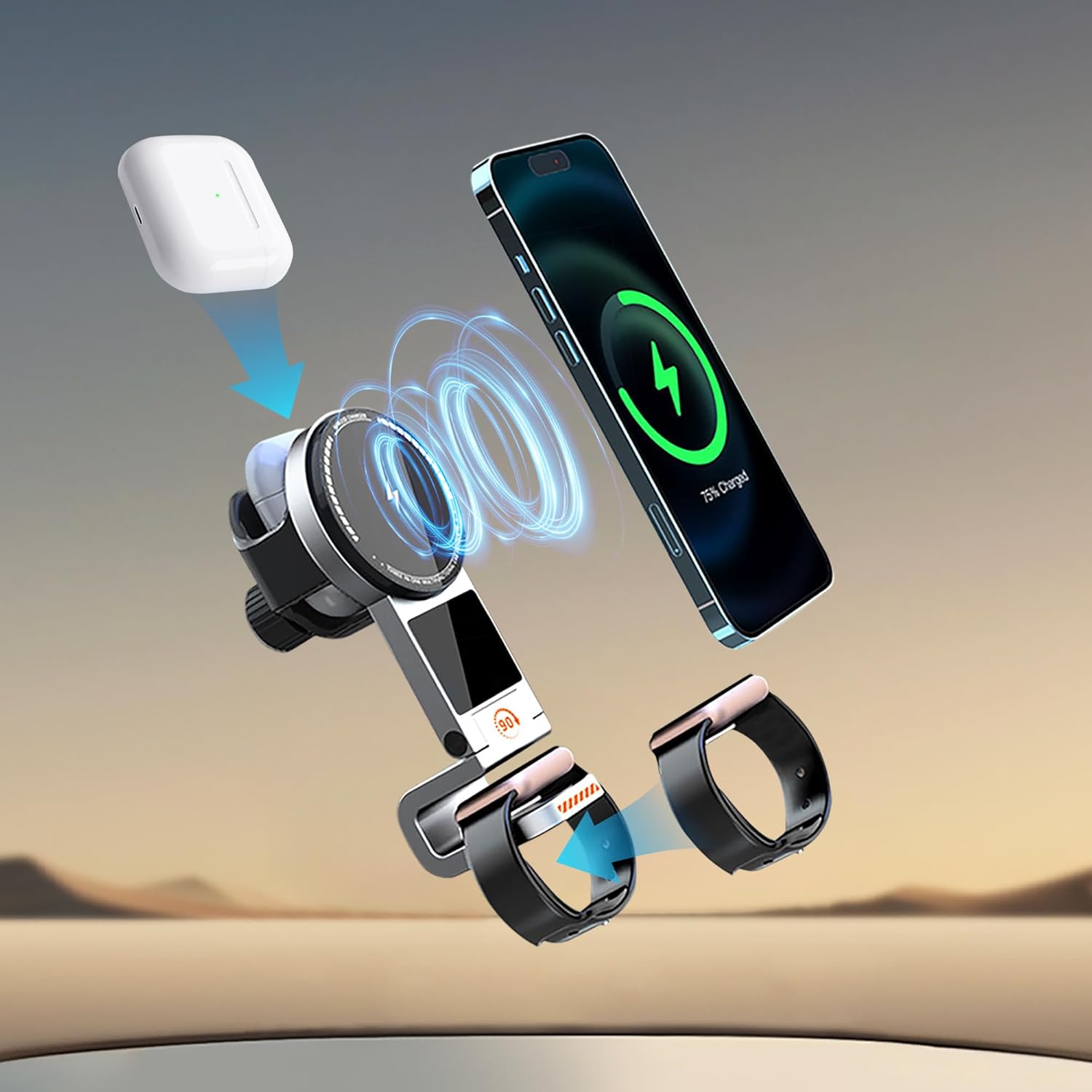 - Widely Compatible: 3-in-1wireless car charger phone holder compatible with iPhone 16/15/14/13/12/11series, Samsung Galaxy S23 Ultra/S23+/S23/S22 Ultra/S22/S21/S20/S10/Note 20/Note 10+/Note 10, LG V50/V40/V30/G8/G7, AirPods and iWatch 10/9/8/7/6/SE/5/4/3/2/Ultra Series, featuring a 15W fast charging capability for compatible devices.<br> Note: Smartwatch charging is only applicable to iWatch, not Samsung watches, etc.