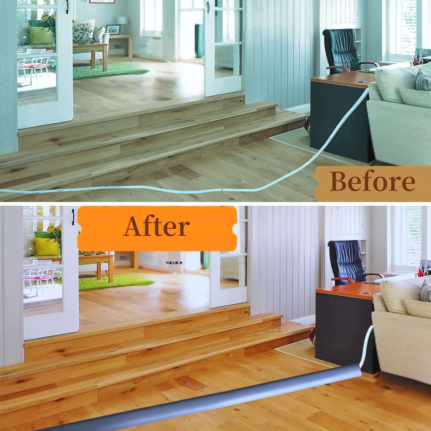 - [Flexible and Durable Floor Cord Cover System] Ultra-flexible PVC material bends effortlessly around corners (no heat required!) and lies flat instantly for quick installation. Scuff-resistant textured surface withstands daily wear while allowing easy wipe-down cleaning. DIY tailoring: Cut with household scissors to fit doorways, desks, or irregular layouts.