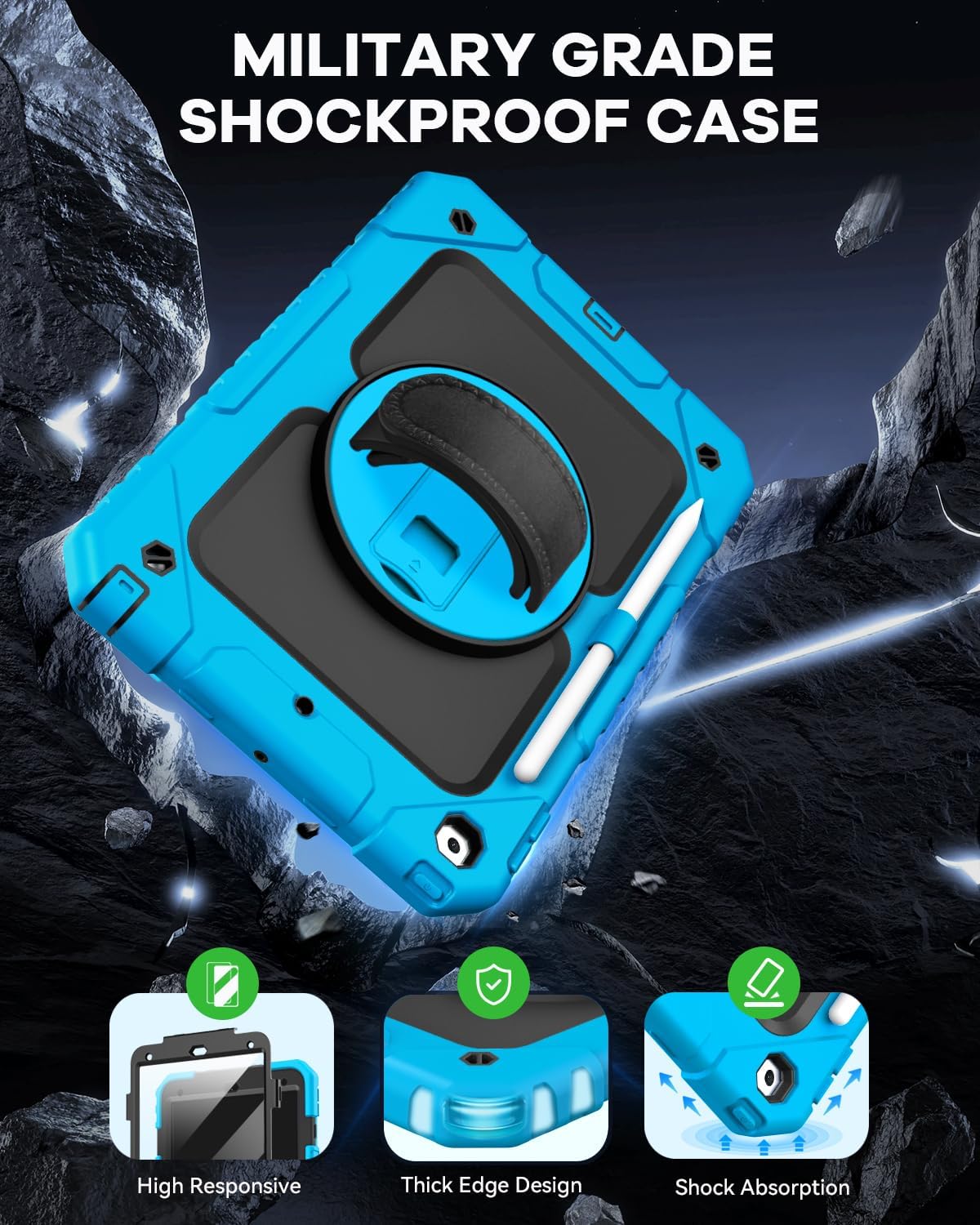 - With Shoulder/Hand Strap & Rotating Stand: The ipad 9th case with portable shoulder/hand strap makes your tablet more conveniently outdoors & indoors, such as display your iPad behind car head rest. 360 degree rotating kickstand provides different typing & viewing angles for studying, gaming, watching video, etc.