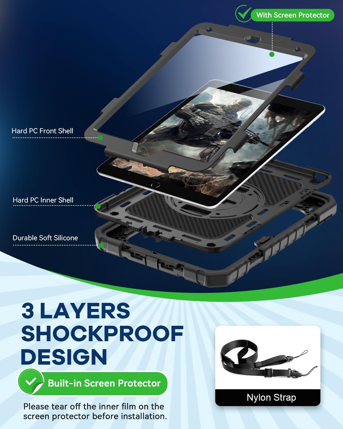 - Built-in Screen Protector: This case for iPad 9th generation kids made of durable hard PC & silicone, 3-layer full body protection structure with SCREEN PROTECTOR, provide a military grade protection & anti-scratch.