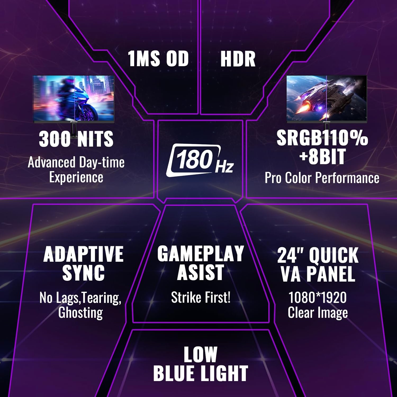 - 24 Inch 180Hz Gaming Monitor with Speakers for Home, Entertainment and Office