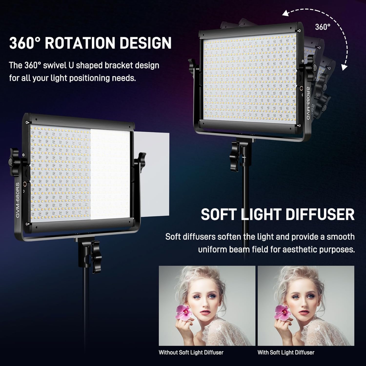 GVM Upgraded 680 RGB LED Video Light with Lighting Stand Kit, 50W Photography Lighting with Bluetooth Control, Studio Light with 18 Lighting Scenes, led Panel Lights for Video Recording, 8500lux/0.5m