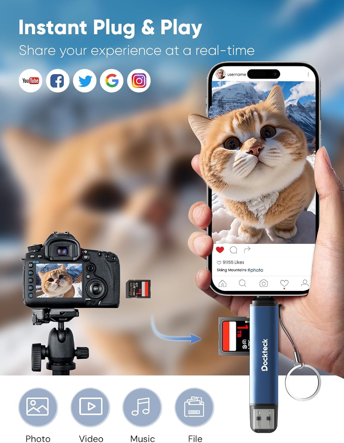 - [Wide Compatibility] Dockteck 3 in 1 memory card reader works forUSB-C / A devices like iPhone16 15 Pro/Pro Max, MacBook Pro (2023~2016), MacBook (2022~2015), iMac Pro (iMac), Acer Aspire Switch 12S/R13, Predator 15/17X, XPS 13/15/17, Alienware 13/15/17, Spectre x360, Microsoft Surface Pro, Book 2, Razer Blade 15/Stealth 13/Pro 17, Samsung Galaxy Tab Pro, S23/ S22 Ultra/ S21/ S20...