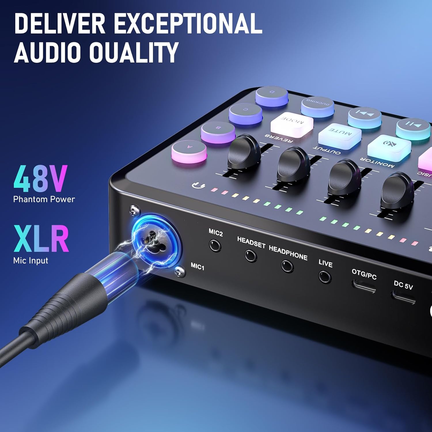 - 【Wide Applications】-- This professional streaming audio mixer uses OTG technology for lossless transmission to avoid current noise and create a higher level of sound quality. Ideal for ps5, microphone studios, home studio recording, DJ mixers, music recording, guitars, condenser microphones, karaoke, podcasting, live streaming, gaming, TikTok, Facebook and YouTube streaming