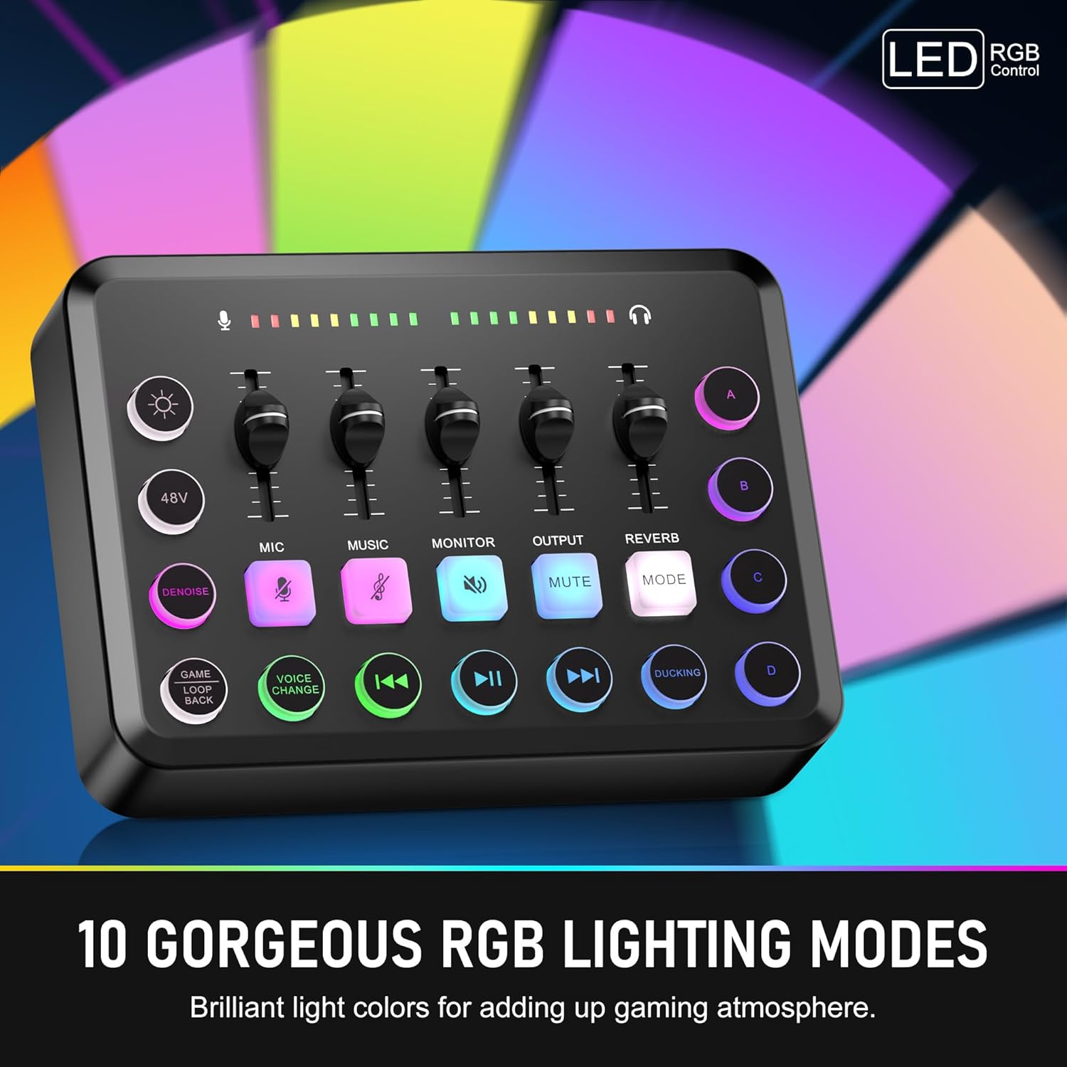 - 【Individual Channel Control & Controllable Vibrant RGB Lighting Effects】-- The music mixer for two mic recording take your streaming to a whole new level with full pleasure. Equipped with smooth volume slider fader, 5 independent channels set on the DJ mixer offers independent control over MICROPHONE, MUSIC, MONITOR, OUTPUT, REVERB. Featuring a variety of lighting effects, you can switch the light color or turn it off via the RBG button to meet your different live themes