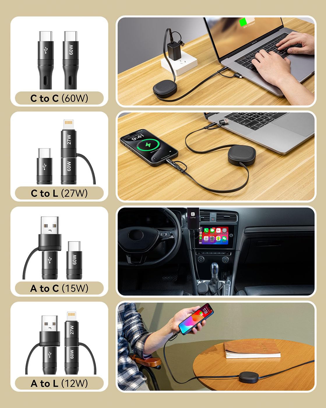 - [5-in-1 Multiple Charging Cable]: YTLUSN Retractable Fast Charging Cable is designed to simplify your life. It has four ports, combines - USB C to USB C (PD 60W), USB C to L (PD 27W), USB A to L, and USB A to C - in one cable. One cable meeds all your charging needs.