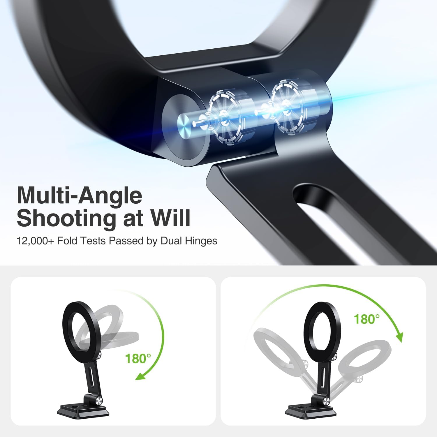 - 【Premium iPhone Tripod Mount Accessory】Elitehood's upgraded phone tripod mount shines with 4 features: ① 20 powerful magnets for instant MagSafe connection with just one hand. ② Dual hinges rotate 180° on the Z-axis for versatile angles. ③ Universal compatibility via 1/4”, 3/8” screw holes, or arca mount base. ④ Crafted from aircraft-grade aluminum for unmatched durability. Perfect for iPhone users seeking a robust, versatile mount.