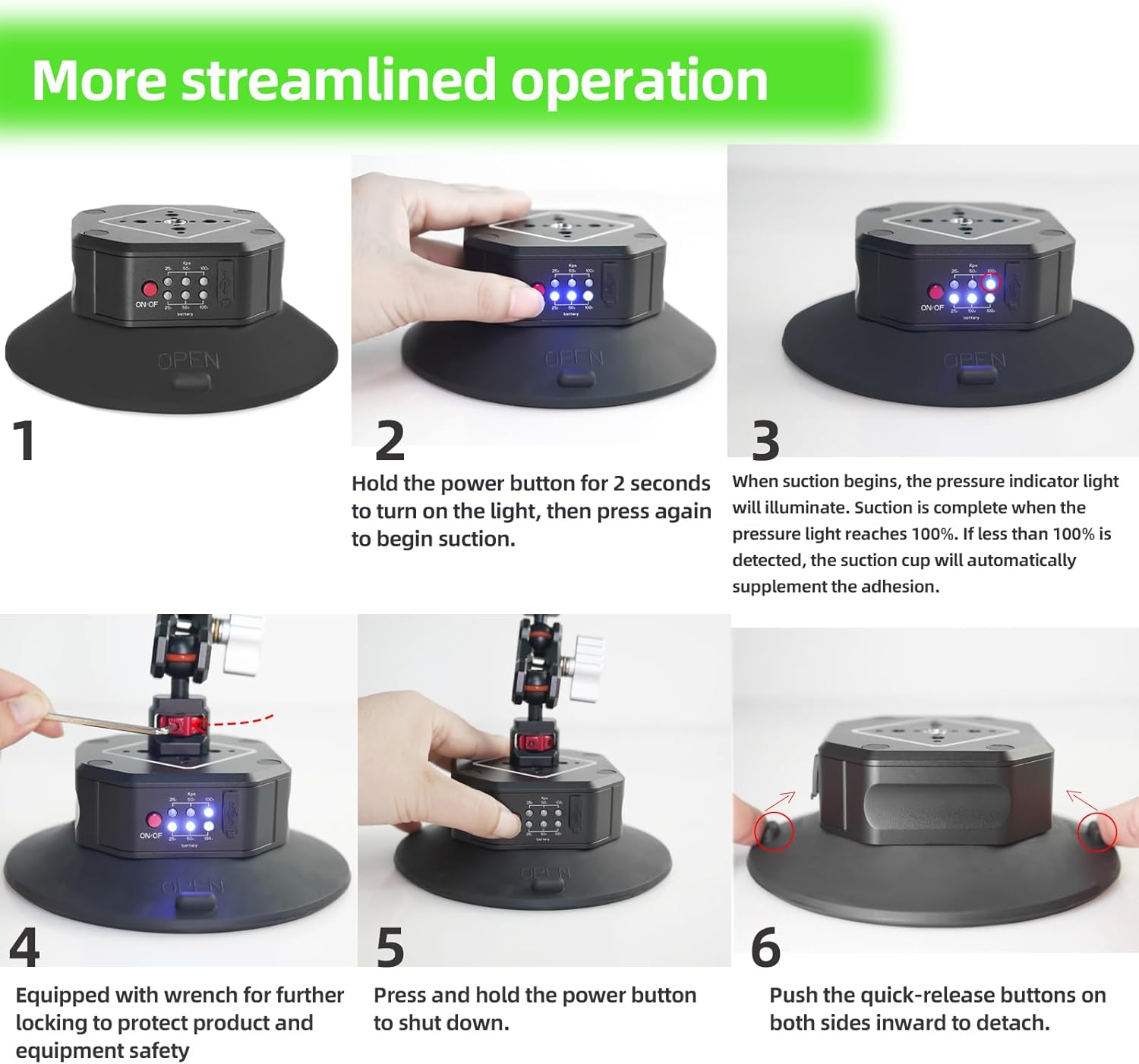 - 【6in Electric Auto Pump Suction Cup Camera Mount】Revolutionize mounting with motorized vacuum technology—replacing manual force. Engage the pump via single button for rapid, precise installation. Features an LED indicator screen with real-time pressure monitoring. Depress dual release buttons simultaneously to disengage suction. Note: Always remove cameras/devices before releasing suction to prevent drops; verify battery level pre-use.