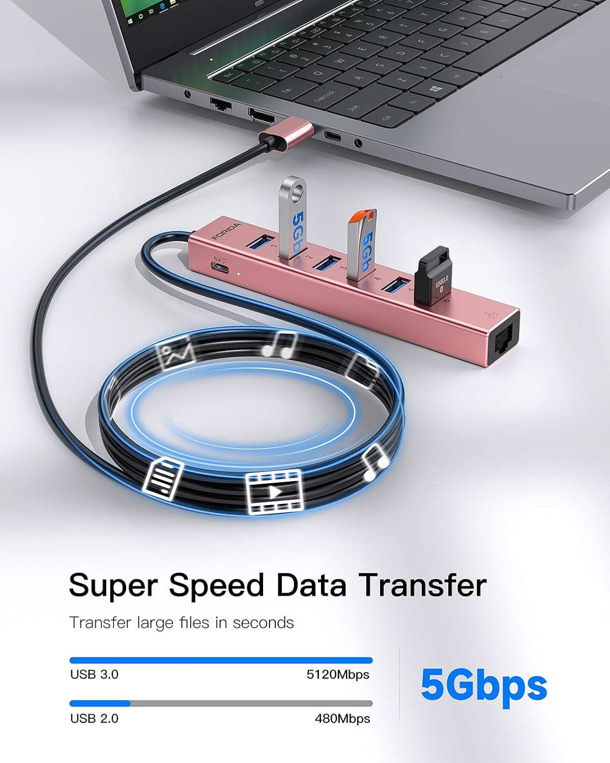 Aluminum USB 3.0 Adapter USB to Ethernet HUB with 120CM Long Cable for Laptop USB Extender with Gigabit Ethernet Port and 5V/3A Power Port 7 Ports USB Hub for iMac PC Flash Drives (Rose Gold)