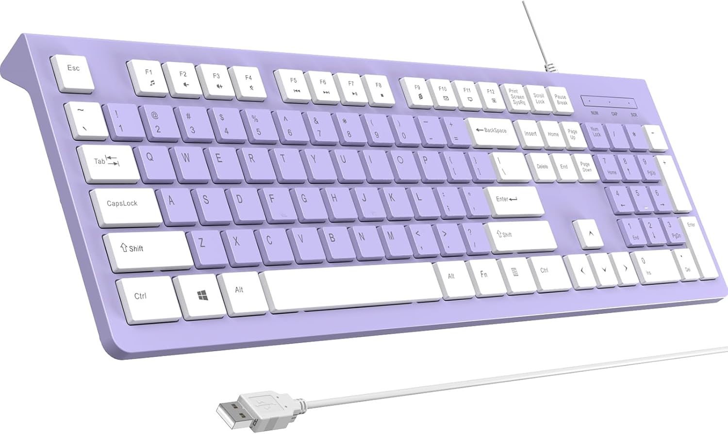 Computer Keyboard Wired, Plug Play USB Keyboard, Low Profile Chiclet Keys, Large Number Pad, Caps Indicators, Foldable Stands, Spill-Resistant, Anti-Wear Letters for PC Laptop (Purple, 1-Pack)