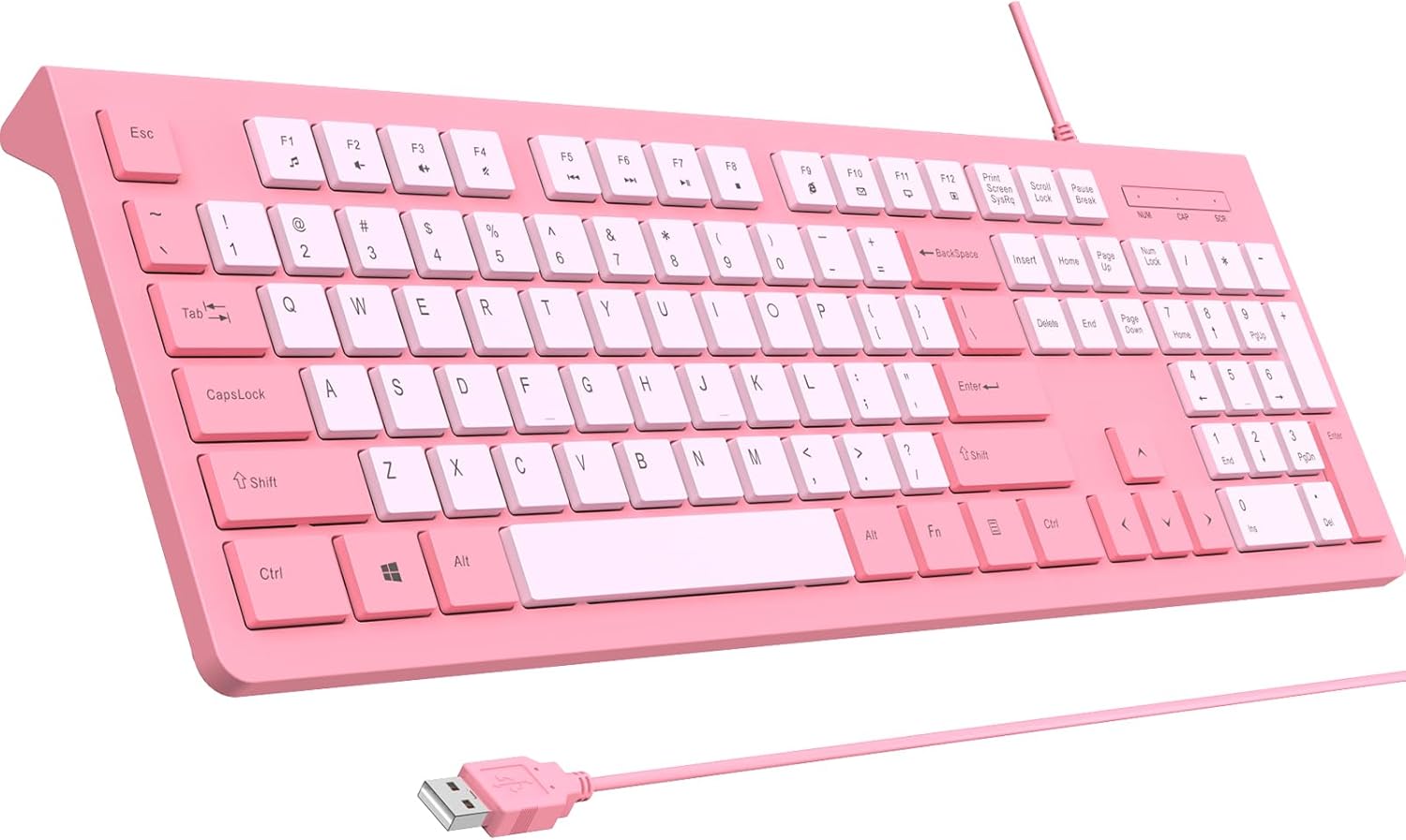 Computer Keyboard Wired, Plug Play USB Keyboard, Low Profile Chiclet Keys, Large Number Pad, Caps Indicators, Foldable Stands, Spill-Resistant, Anti-Wear Letters for PC Laptop (Rose Pink, 1-Pack)