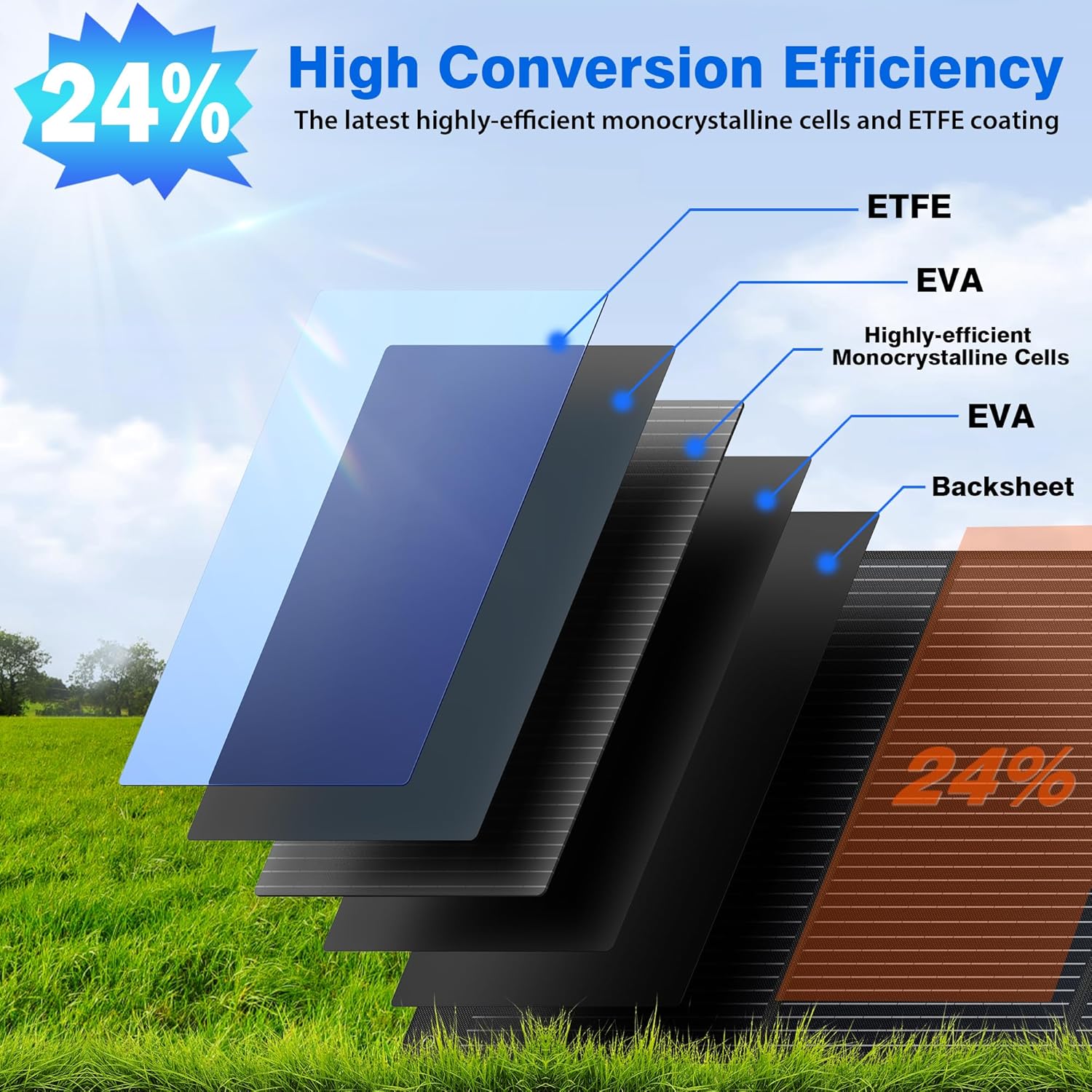 - High Solar Conversion Efficiency Up To 24%!!! This portable solar panel uses the latest highly-efficient monocrystalline solar cells that convert the sunlight efficiently into clean energy with high conversion efficiency of up to 24%! You can fully charge a 500W power station with Aonxi portable solar panel within 3 hours during peak sunlight hours.