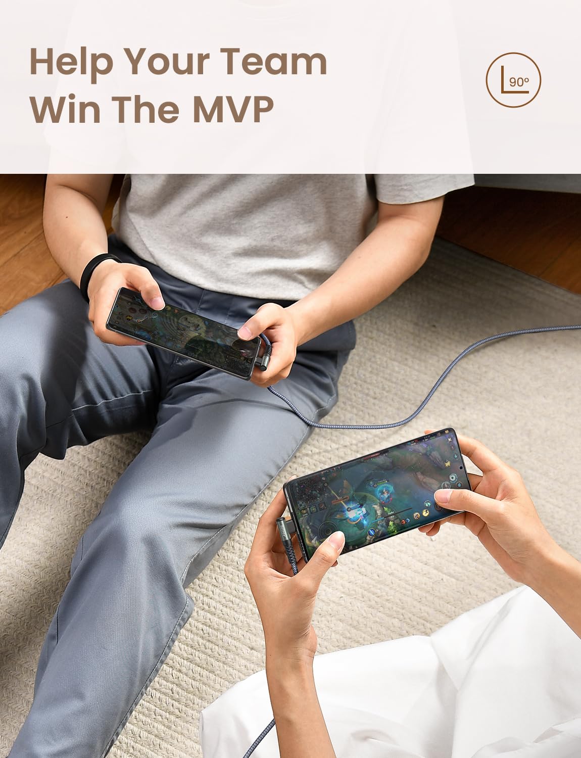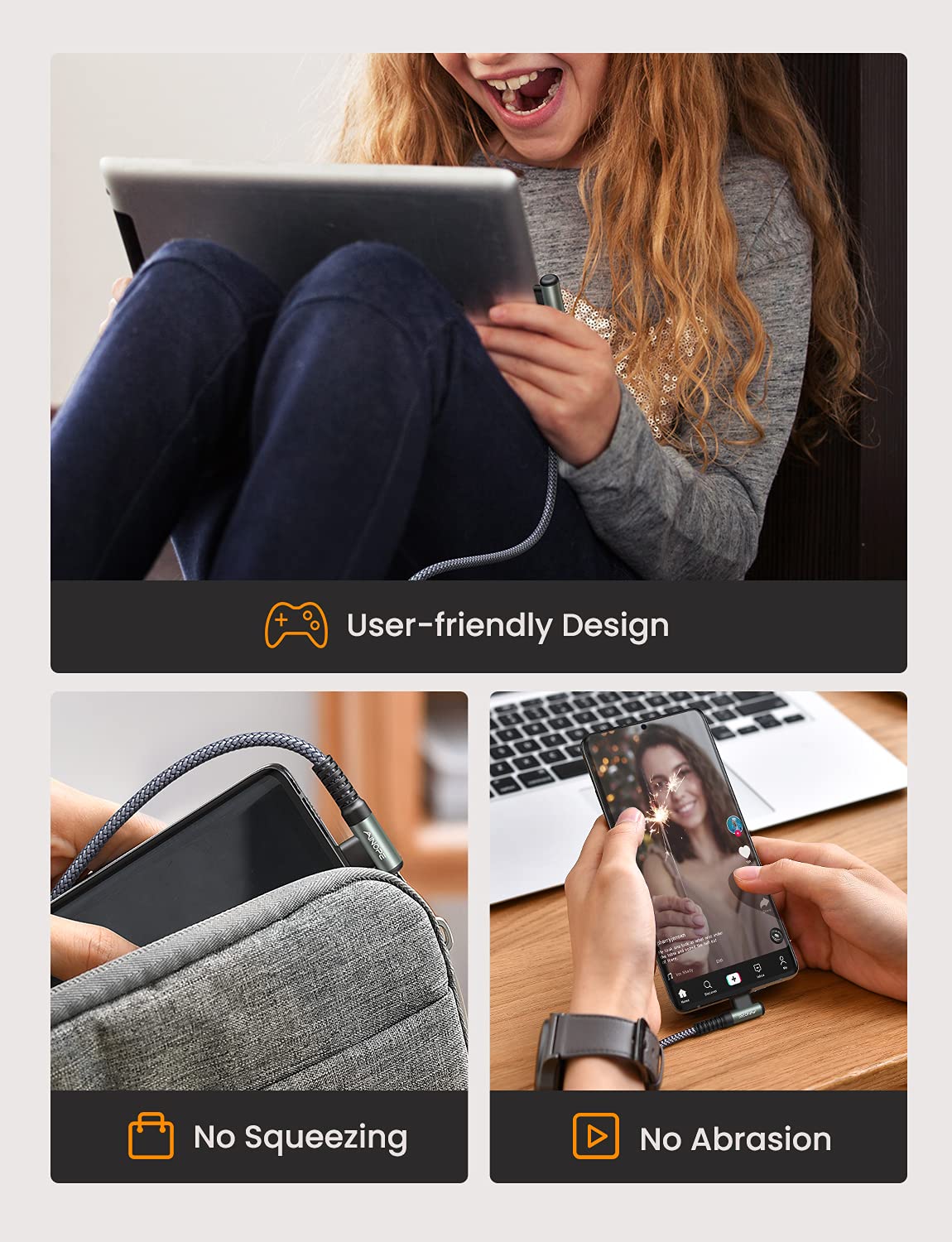 - [Upgraded Exclusive Right Angle Design] This right angle type c charging cable fast charge with an innovative 90 degrees " L " design. It's user-friendly design more convenient and comfortable for playing games, watching videos, reading e-books when you charging. 【 NOTE: The thickness of the compatible mobile phone case charging port is 5.5mm.】