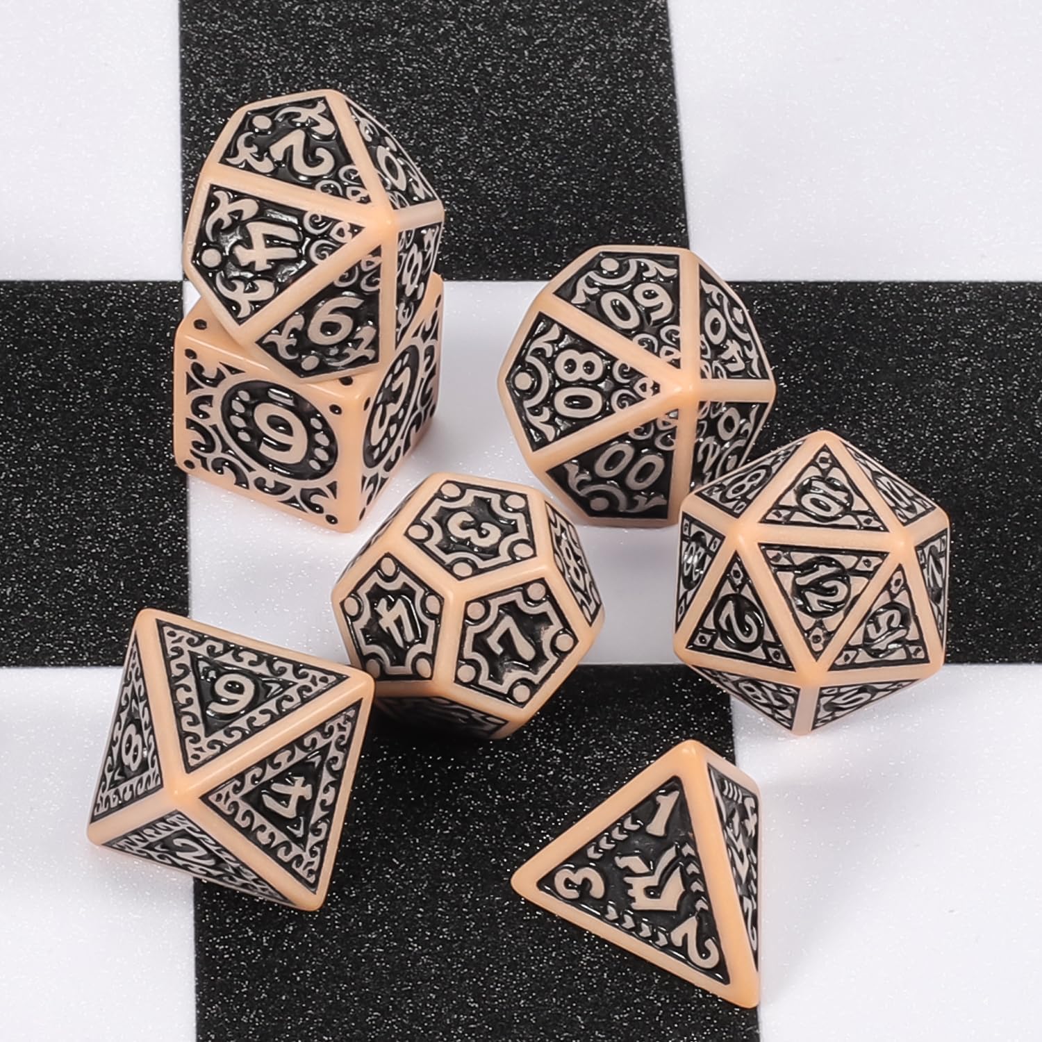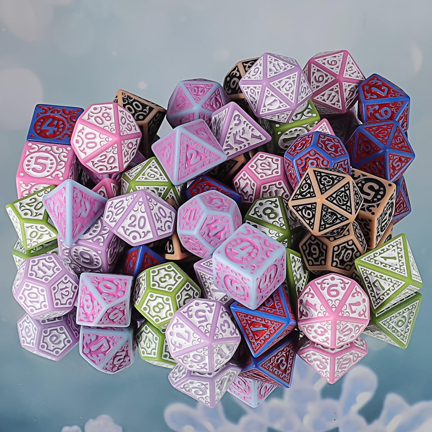 - Fantasy Roleplay Dice Set: 6 sets polyhedral dices, each 7-die set contains 1 piece d20, 1 piece d12, 2 pieces d10 (00-90 and 0-9), 1 piece d8, 1 piece d6, 1 piece d4; 42 Pieces in total.