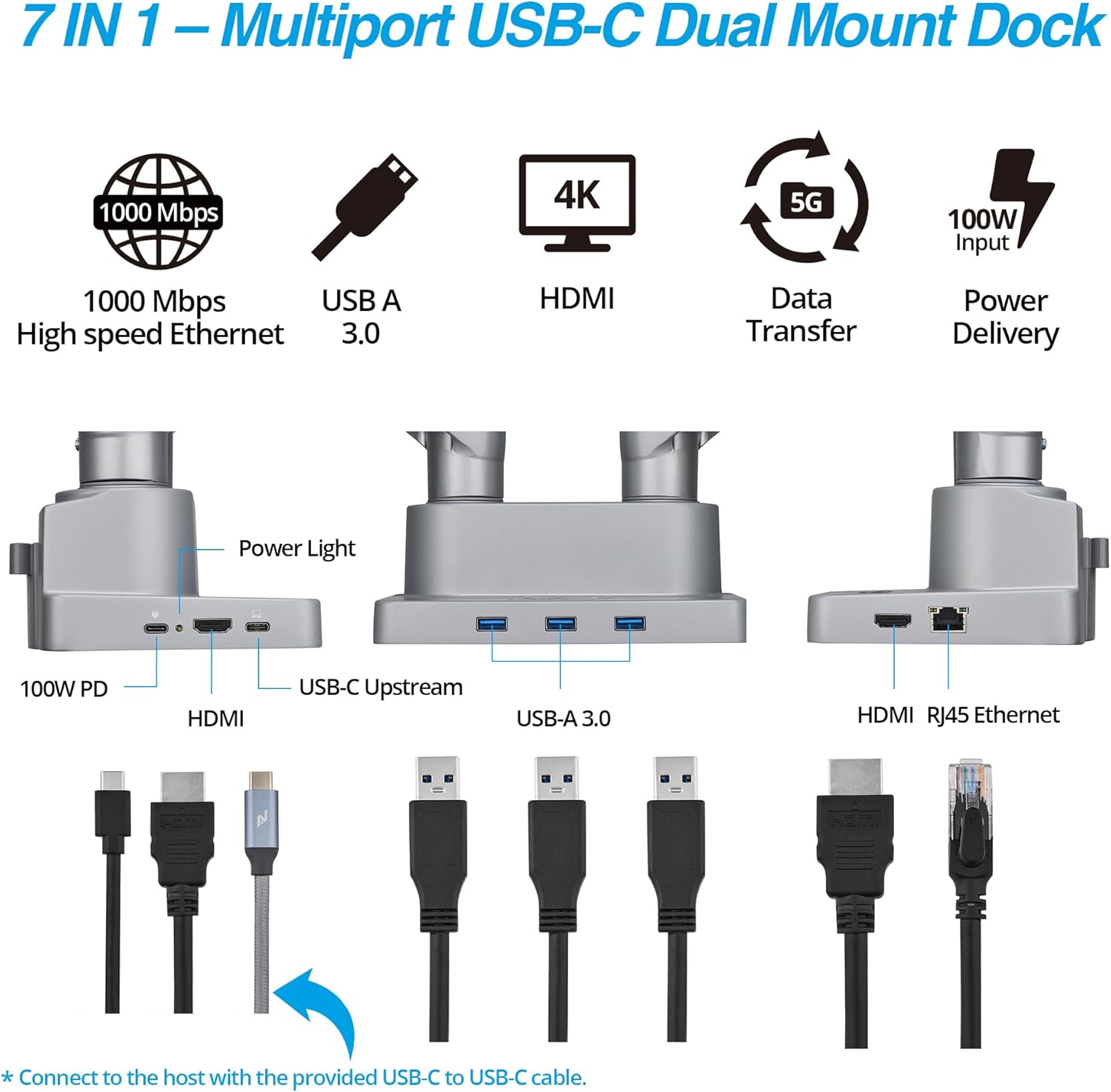 - 7-in-1 Docking Station Base: Integrated base includes 3 USB-A 3.0 ports (5 Gbps), 2 HDMI ports (MST), 1 RJ45 Ethernet port (1 Gbps), and 1 USB-C 100W PD input; requires full-function USB-C 3.1 Gen 2 port or above.