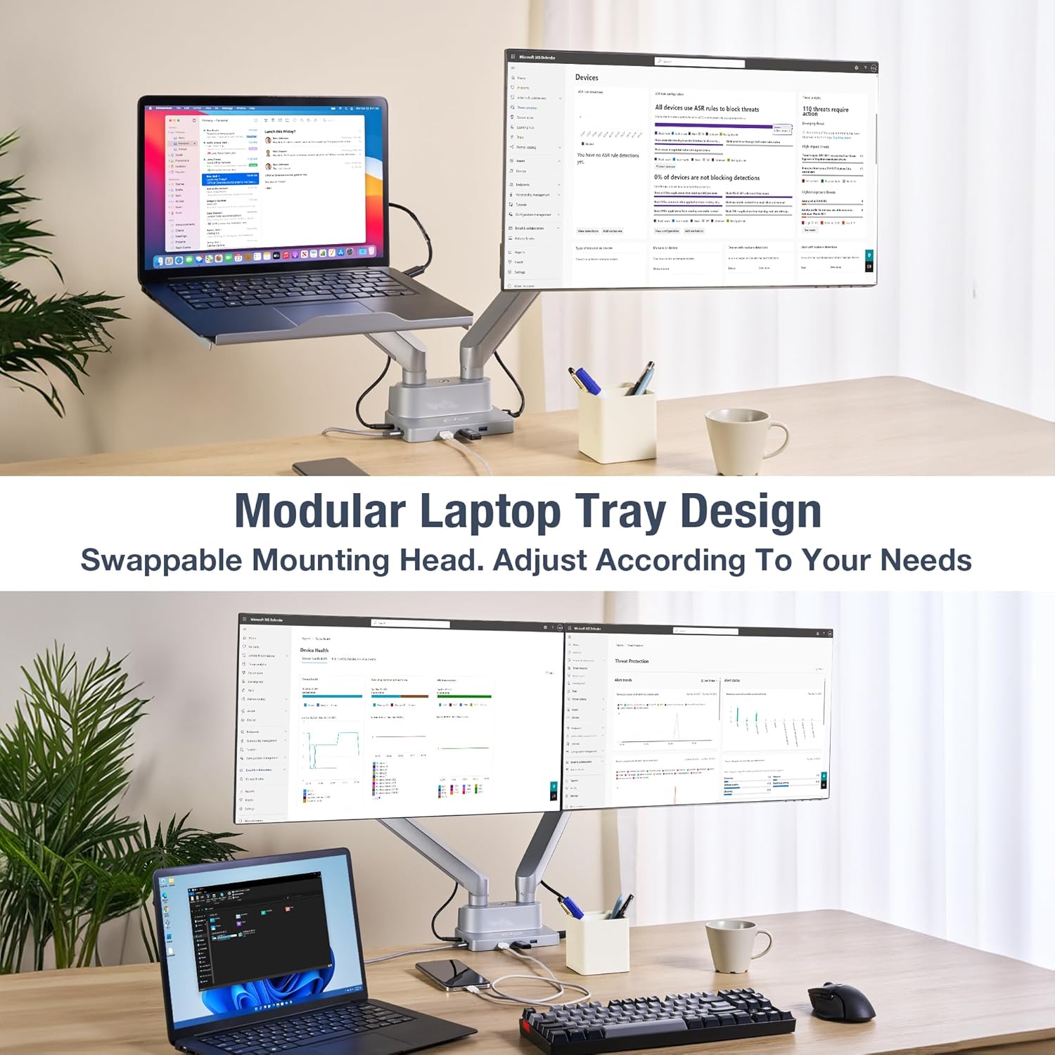 - Dual Arm Mount With Laptop Tray: Heavy-duty mechanical spring arms support a monitor and an adjustable laptop tray; includes quick-release VESA plate for easy installation.