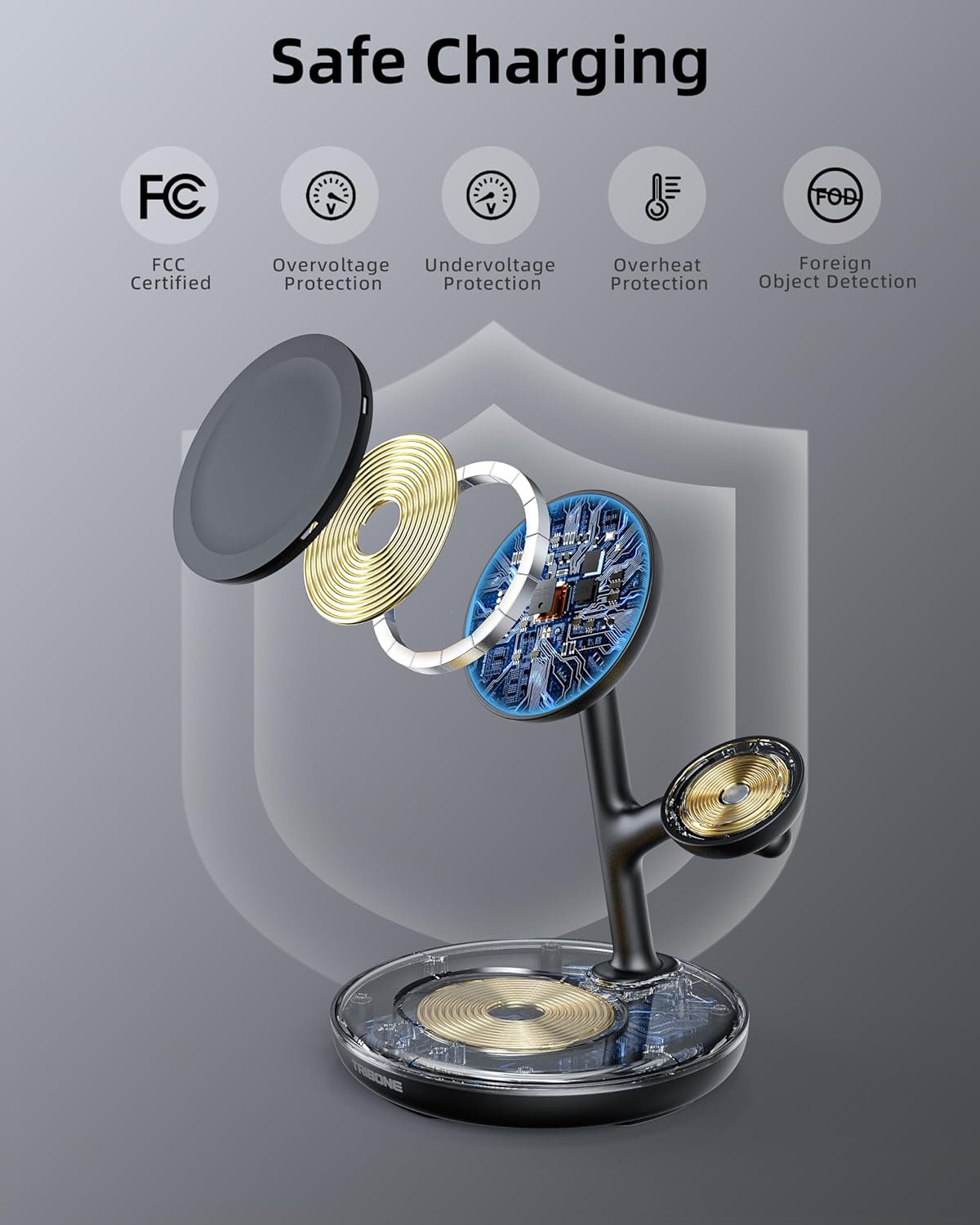 - Built to Last: Made from high-quality metal and plastic materials, this wireless charger features a non-slip silicone base for enhanced stability. No more worrying about devices slipping or moving during charging.