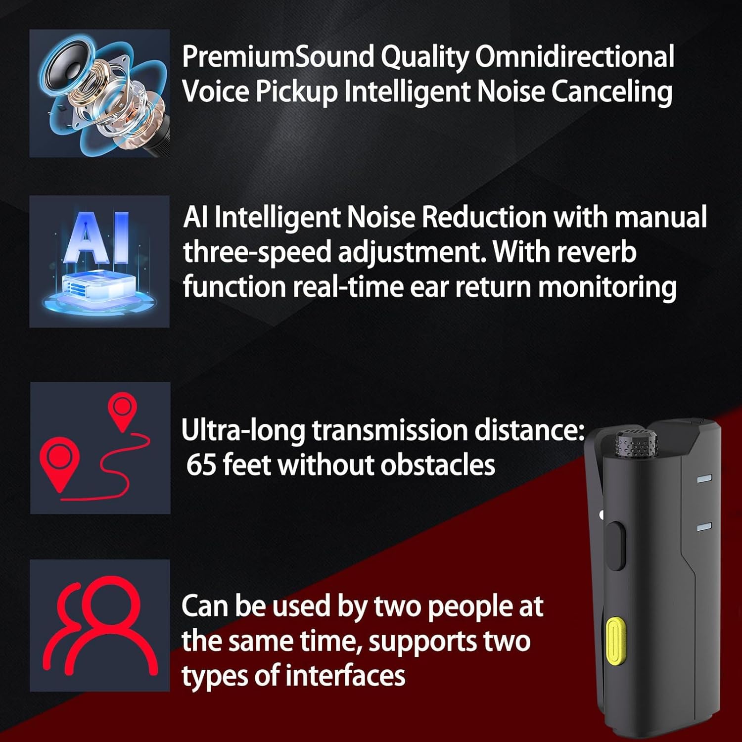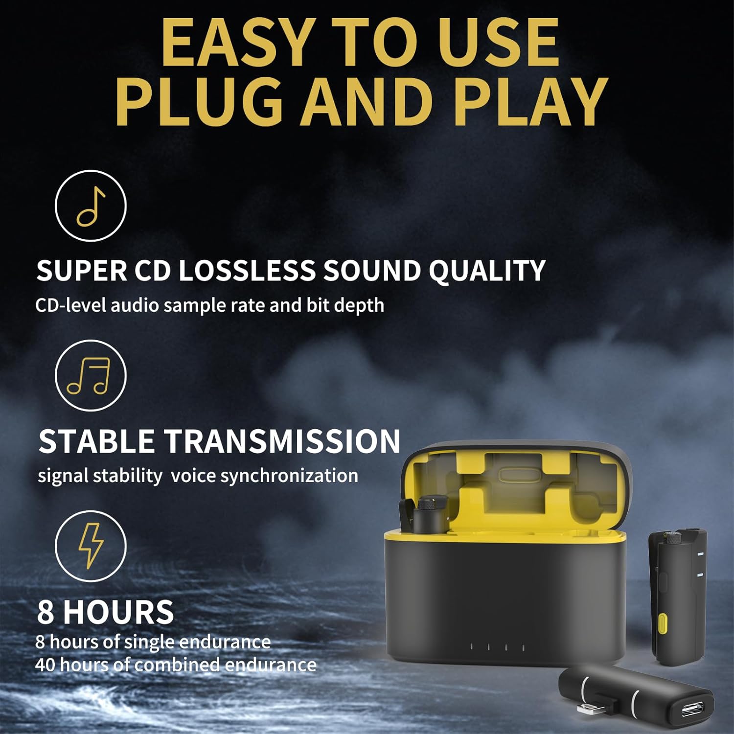 - Stable transmission and free recording: New 2.4G wireless transmission technology Sampling rate: 48KHz Stable transmission Strong penetration Stable signal and voice synchronization,Lossless sound quality: Lossless and uncompressed recording at CD-quality audio sample rate and bit depth