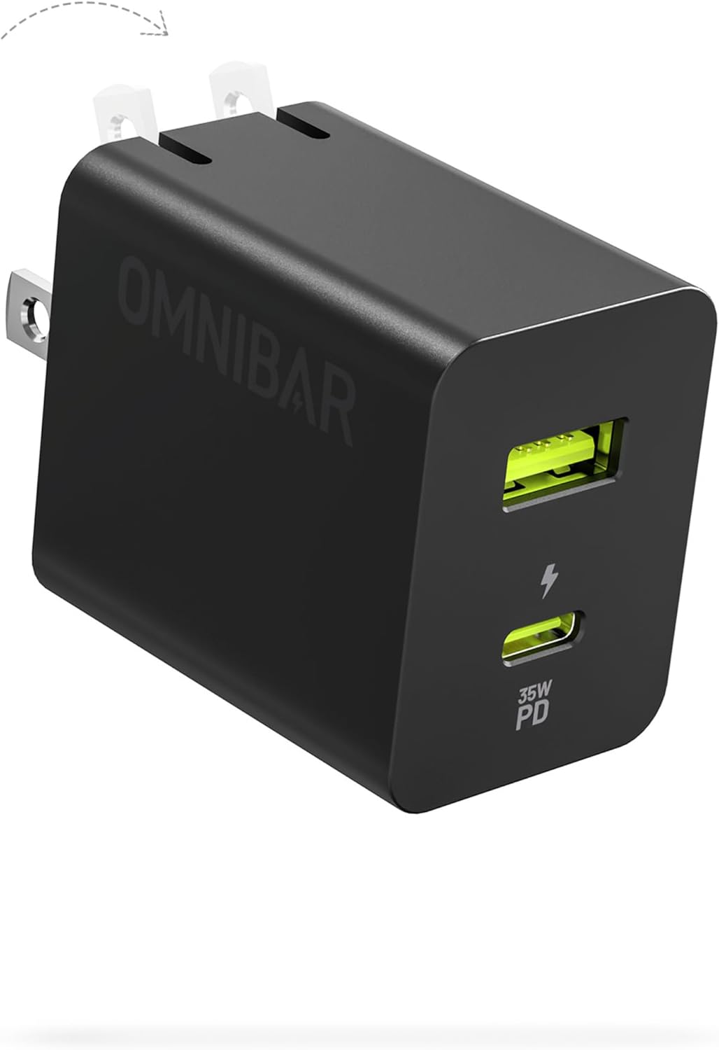 - Dual-Port Design: Equipped with both USB-C and USB-A ports, the Omnibar 35W Dual-Port USB C wall charger allows for the simultaneous charging of two devices, enhancing charging efficiency. When both ports are used together, up to 15W of charging power is delivered by each, satisfying the demands of charging multiple devices at once.