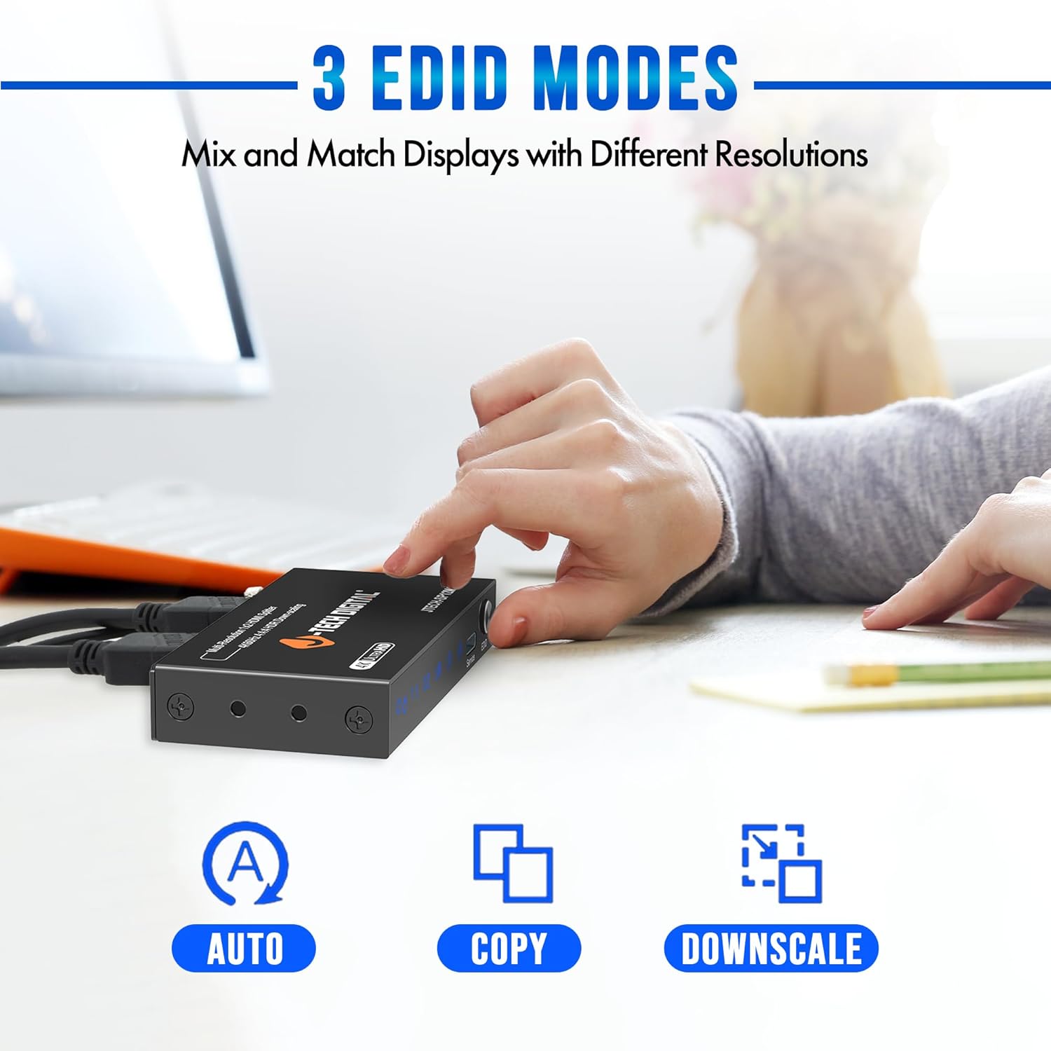 - ✅ 3 EDID Settings & Digital Audio Format Support: Features EDID auto, copy, and downscaling settings to help resolve source and display incompatibility issues. This HDMI splitter supports both compressed and uncompressed digital audio formats.