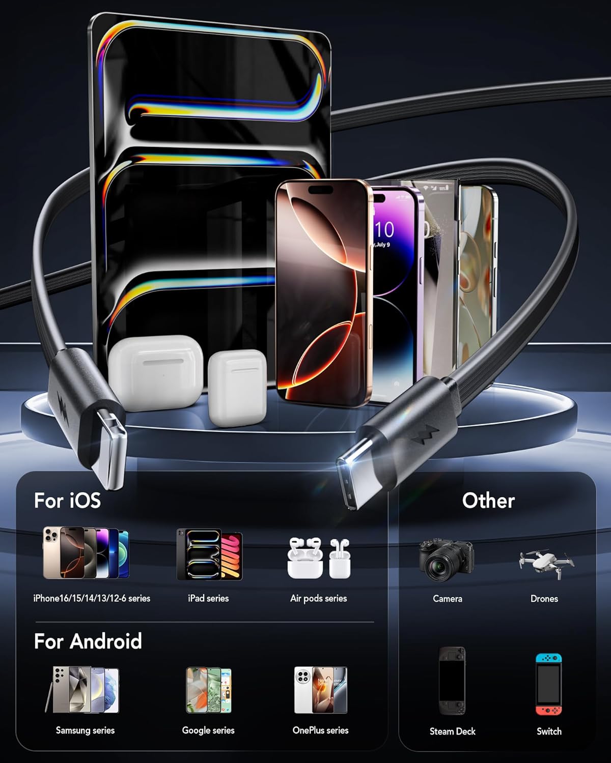 - 【90cm Retractable Cable for Maximum Convenience】 The retractable wall charger block comes with two 90cm retractable cables ,one Lightening and one Type-C. The maximum retractable length of the iphone charging cable is 90cm (35.5 inches), ensuring that you have a retractable charger for all lengths. It is neatly stored, and after unplugging the cable, you only need to gently stretch 1cm to retract the cable.