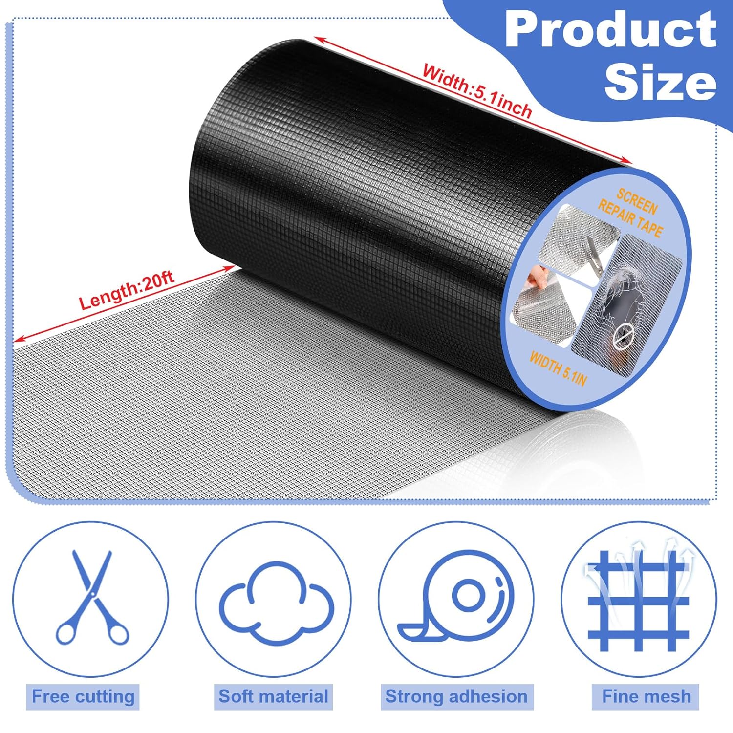 Extra Wide 5 inch x 20 ft Window Screen Tape Mesh Repair Strong Adhesive Waterproof Fiberglass Screen Repair Kit Patch for Window Door Tears Holes(Black)