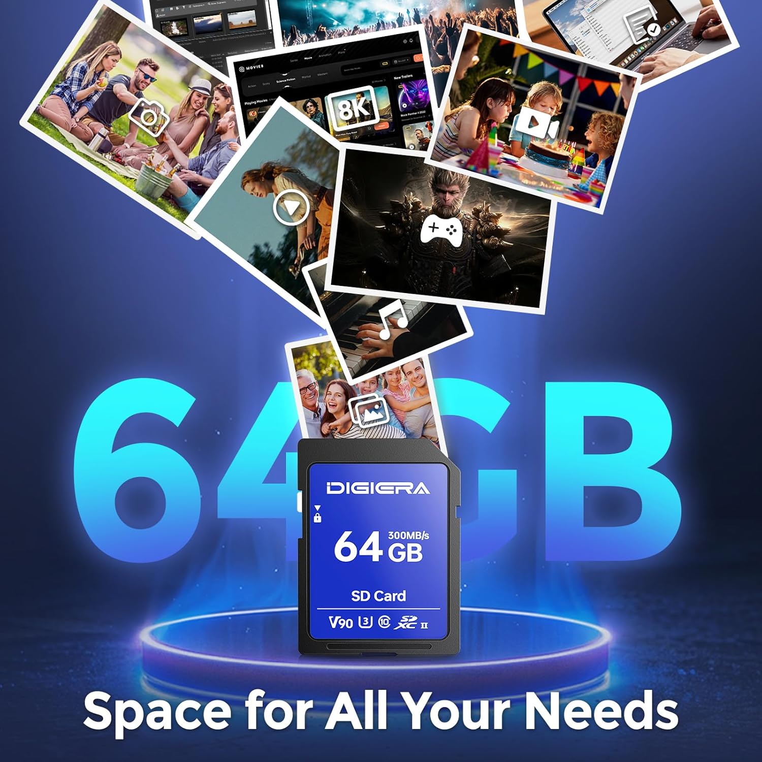 - Professional-Grade Video Recording: Rated C10, V90, and U3, the DIGIERA 64GB SD card delivers unmatched performance for 8K video recording and high-speed continuous shooting. It’s tailored for filmmakers, professional advertisers, and elite content creators who demand precision for complex scenes or multi-camera setups