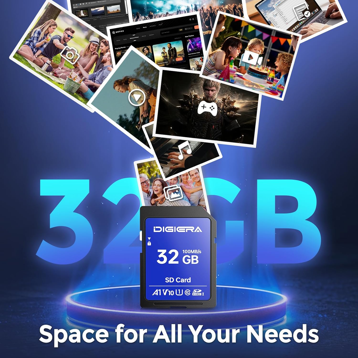 - 32GB Practical Storage: With 32GB of storage space, the DIGIERA memory card holds approximately 6,000 high-resolution photos or 3+ hours of Full HD video. Due to different capacity algorithms and partial capacity used for system files, management, and performance optimization, the available capacity may be less than the identified capacity