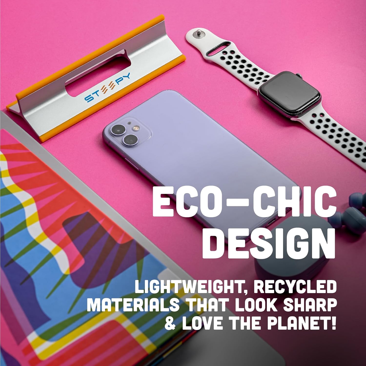 • SETUP'S A BREEZE - Just unfold and go—no screws, no hassle. Instant use, instant time saver! Steepy desk laptop stand is a travel laptop stand made out of strong and durable recycled plastic, with rubber edges to provide the sturdy and stable support your device needs and prevent it from sliding or skidding.
