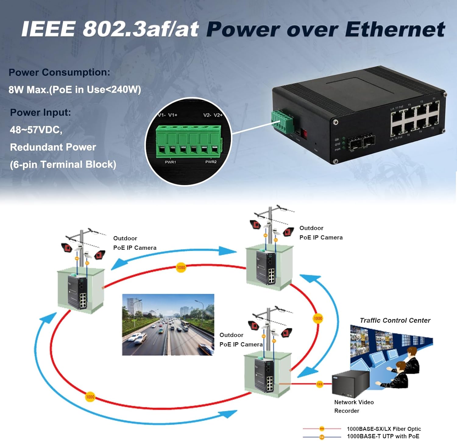 - 【IEEE802.3af/at PoE compliant】The industrial PoE switch provides 8-port IEEE802.3af/at PoE+(30W) function for kinds of Powered Devices to receive power as well as data over the RJ-45 cable.