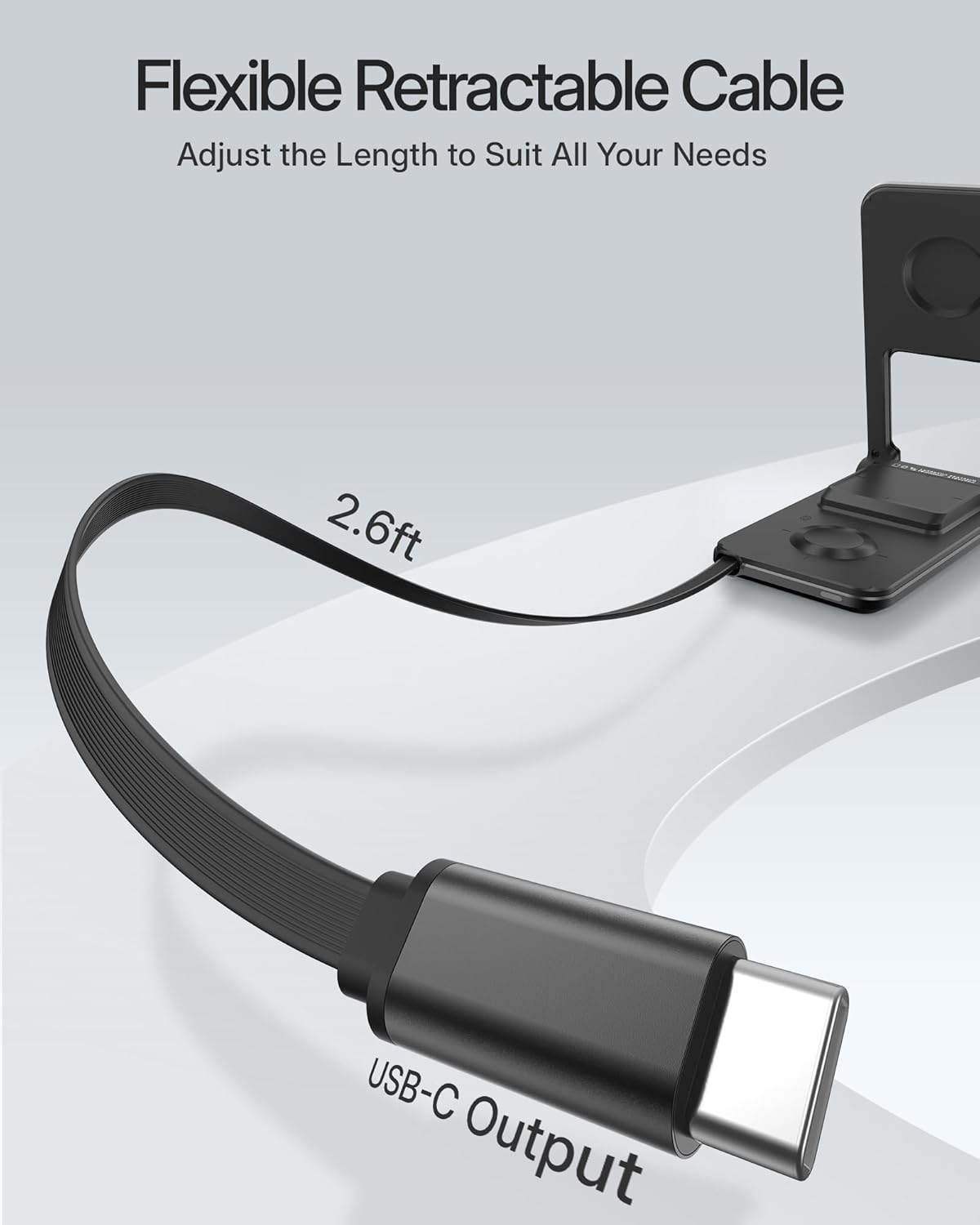 - Flexible Retractable Cable: The charger stand comes with a built-in 2.6ft retractable USB-C cable. Simply push the button at the back to extend the cable, and gently pull to retract it. Say goodbye to tangled cords and messy cables, keeping your space neat