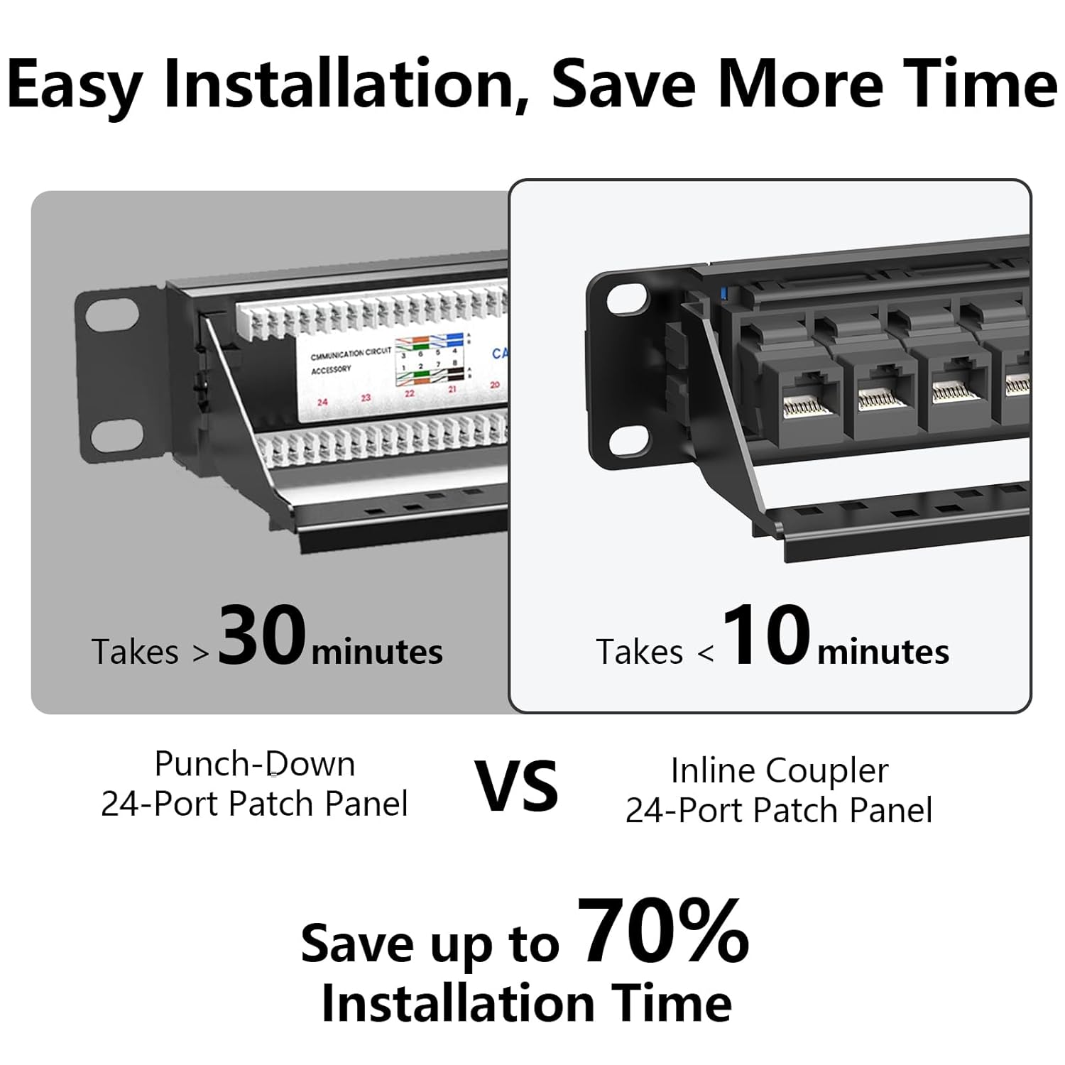 - 🔹 No Tools Needed, Save Setup Time – Preloaded with 24 Cat6 RJ45 couplers, this patch panel lets you plug cables directly without punch-down tools. Installation takes only minutes, saving up to 70% time compared to traditional panels.
