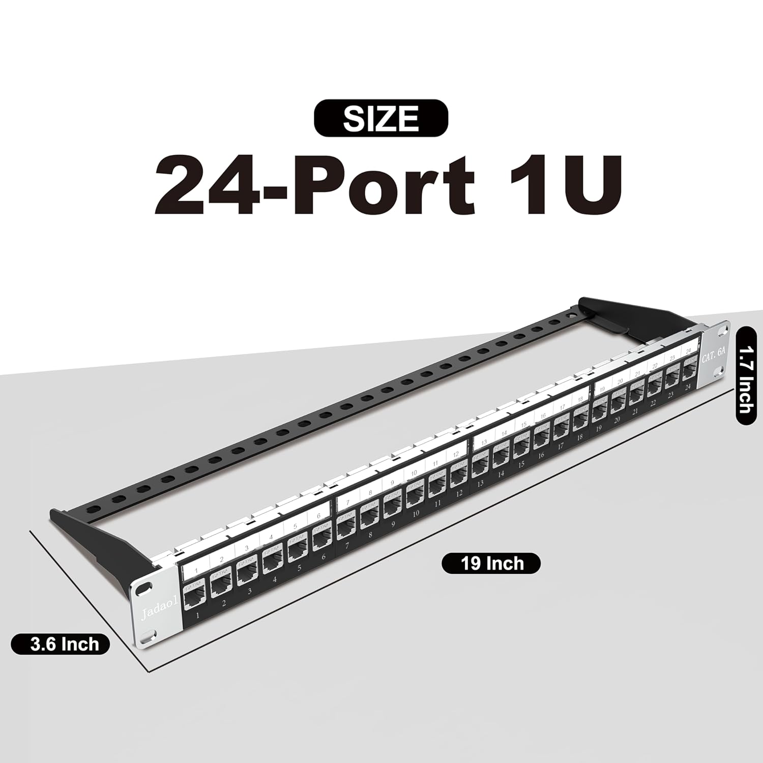 Jadaol 24 Port Shielded Patch Panel Rack or Wall Mount 19-Inch, 1U Cat6A Network Panel Preloaded with 24 Keystone Couplers Plus 1 Spare, 10Gbps Ethernet Panel with Cable Management & Back Support Bar