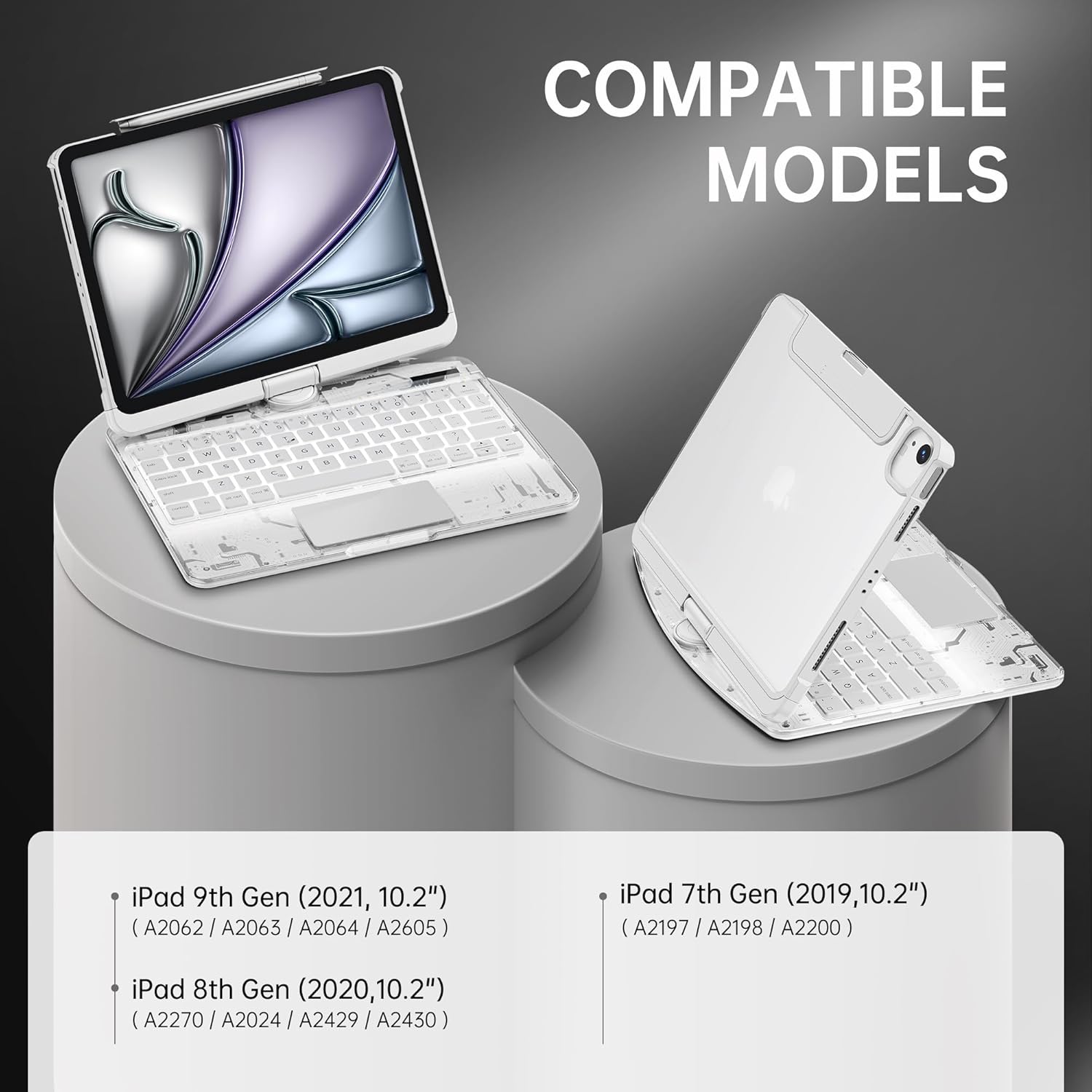 GUSGU Transparent Case with Wireless Keyboard for iPad 10.2-in (7th, 8th, and 9th Gen), 7 Colors Backlight, Trackpad, 360°Rotating Stand, Tech Style