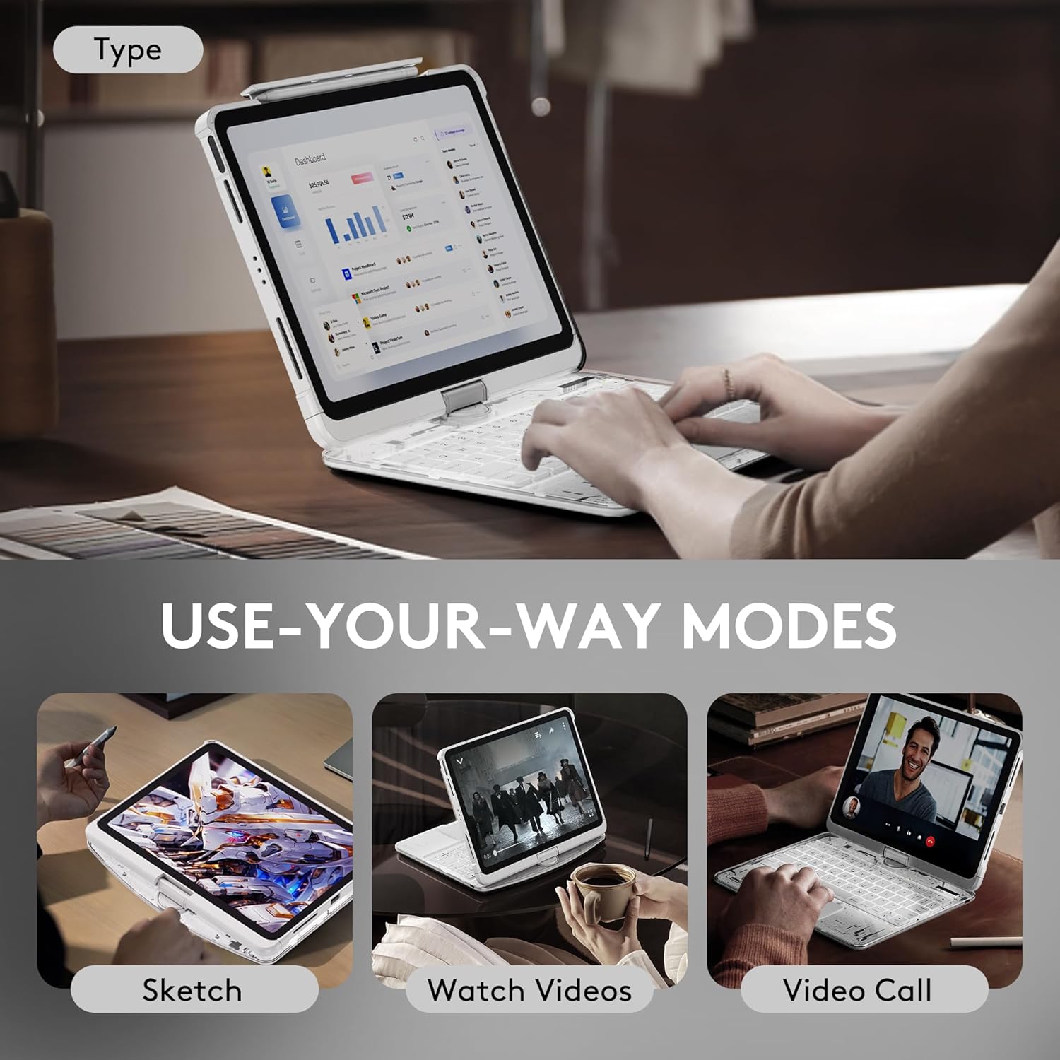 - 360° Rotating Stand & Multi-Angle Viewing: Enjoy full flexibility with the 360° swivel stand, offering 5 adjustable viewing angles. Whether you're typing, sketching, or watching a movie, seamlessly shift your iPad for maximum comfort and productivity in any mode.