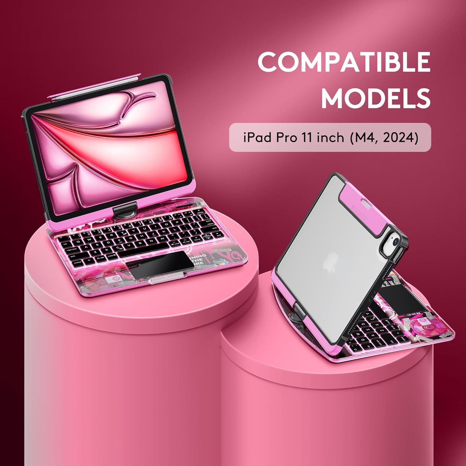 GUSGU Transparent Case with Wireless Keyboard only for 2024 iPad Pro 11-in.(M4), 7 Colors Backlight, Trackpad, 360°Rotating Stand for iPad Pro 11(5th Gen), Tech Style