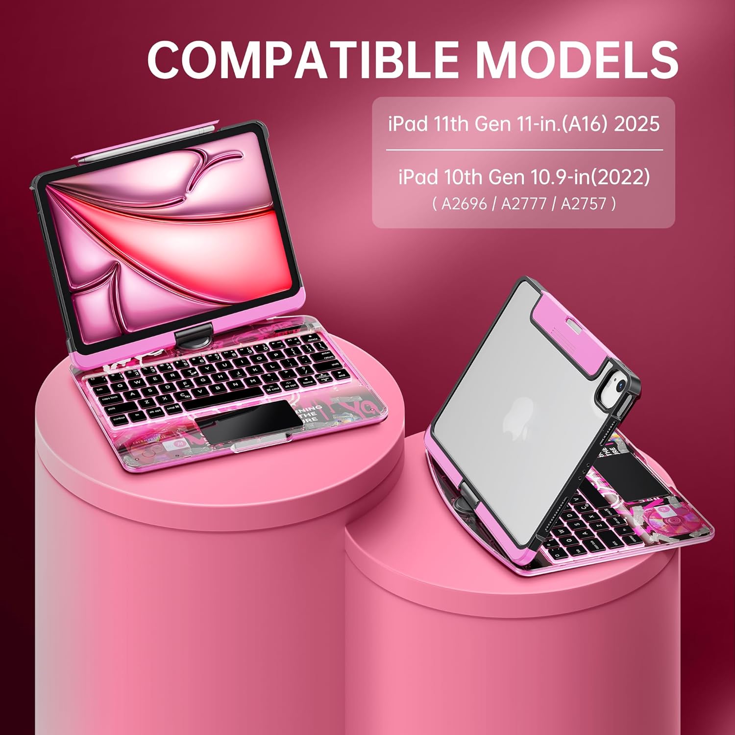 GUSGU Transparent Case with Wireless Keyboard for iPad 11th Gen 11-in.(A16, 2025), 2022 iPad 10th Gen 10.9-in, 7 Colors Backlight, Trackpad, 360°Rotating Stand, Tech Style