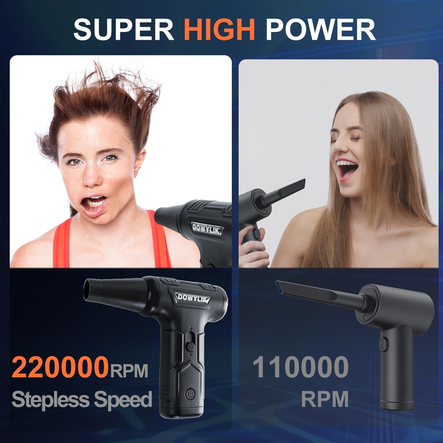 - 【220000RPM Strong Compressed Air Duster】: The DOWYLIK compressed air duster made with upgrated brushless motor, it offers powerful deep cleaning capabilities with a stepless speed from 80,000RPM to 220,000RPM. The stepless speed control is specifically engineered to optimize dust cleaning across different tasks. This compressed air duster delivers powerful airflow, effectively removing dust and debris from tight spaces on keyboards and electronic devices. It's an ideal gift for men