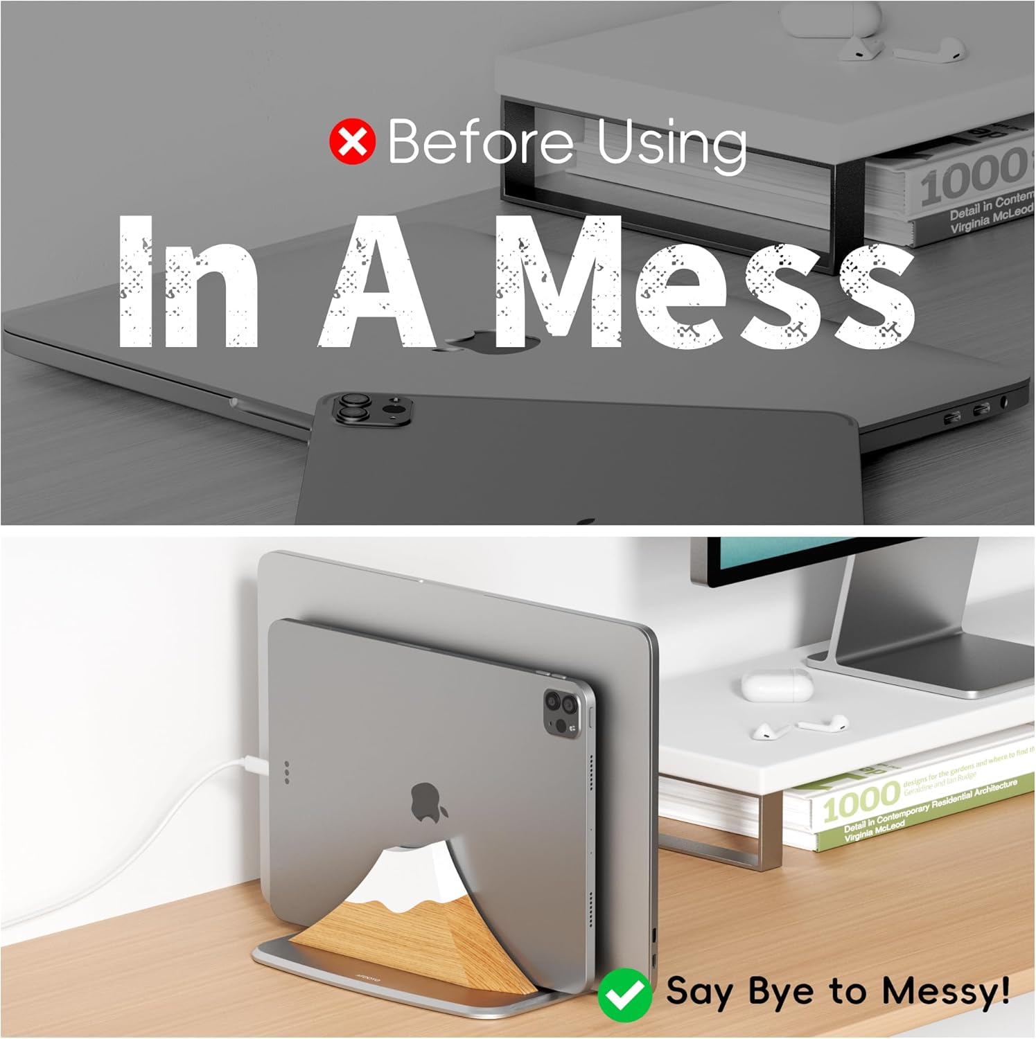 - Dual-Slot Vertical Design:This laptop stand features a dual-slot vertical design, allowing you to store two laptops upright simultaneously. By maximizing vertical space, it significantly reduces desk clutter compared to traditional horizontal stands. Perfect for home or office use, this design keeps your workspace organized, efficient, and visually tidy, while offering enhanced space utilization for a cleaner, more productive environment.