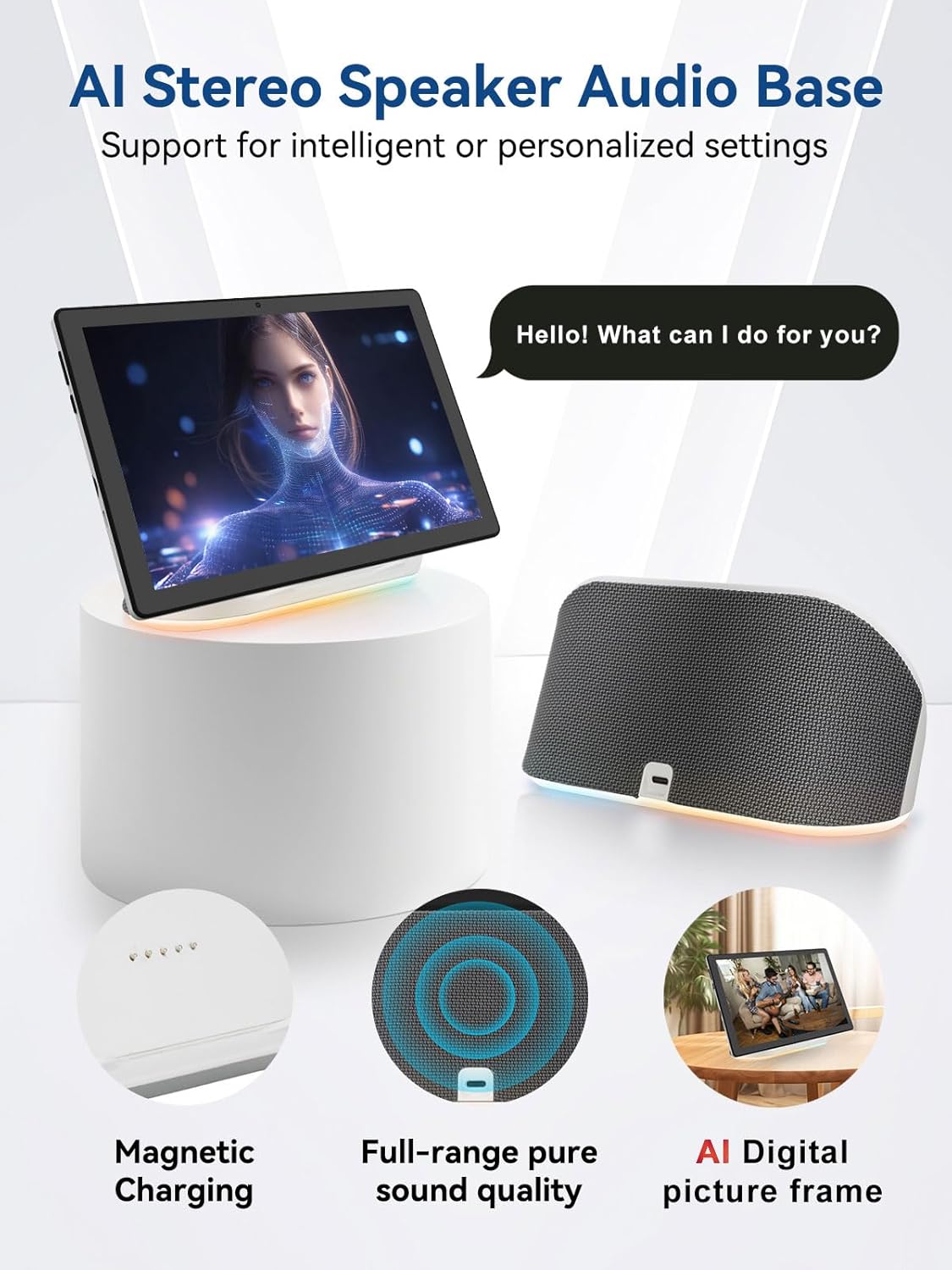 - đľăAll-in-One AI Stereo Speaker DockăTransform your Jeazans tablet into a multifunctional hub with the AI Smart Speaker Dock. Keeps it charged and ready 24/7 and doubles as a great-sounding speaker for room-filling music while ambient lights sync with your music for an immersive audio-visual experience. Dive into relaxation with 8 built-in white noise environments, or switch to the AUMI AI OS clock screensaver mode to use it as a digital clock. It doubles as an electronic cloud photo frame, showcasing your favorite memories. Combining charging, entertainment, and utility, this dock redefines tablet accessories.