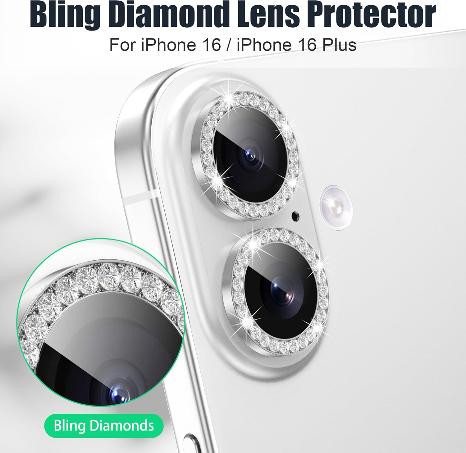 AGVEE 3+3 6 Pack for iPhone 16 6.1" / 16 Plus 6.7" Camera Lens Cover Protector, Bling Diamond & Bling Glitter Metal Ring 9H Tempered HD Glass Camera Cover Protector Film, Bling-Silver