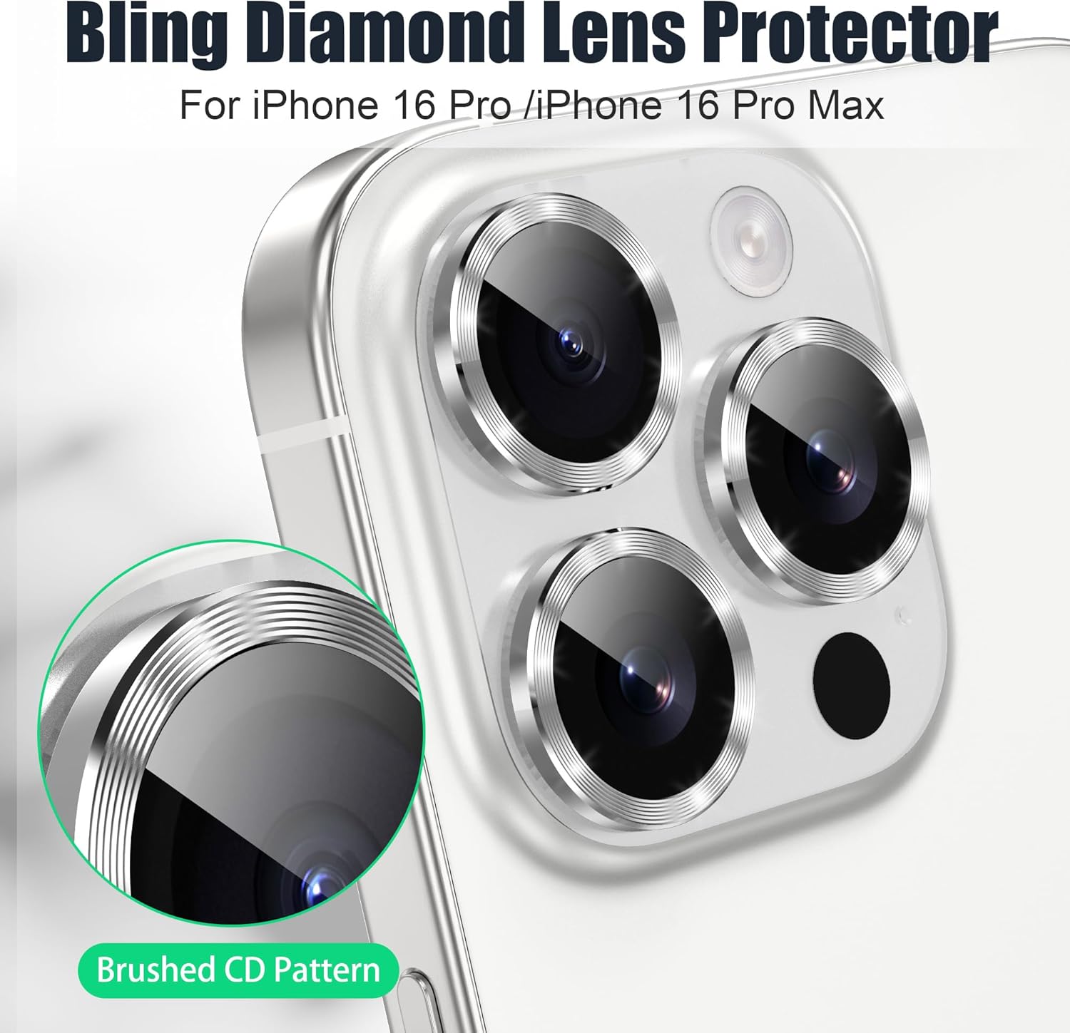 AGVEE 3+3 6 Pack for iPhone 16 Pro 6.3" / 16 Pro Max 6.9" Camera Lens Cover Protector, Bling Glitter & CD-Textured Metal Ring 9H Tempered HD Glass Camera Cover Protector Film, Glitter-Silver