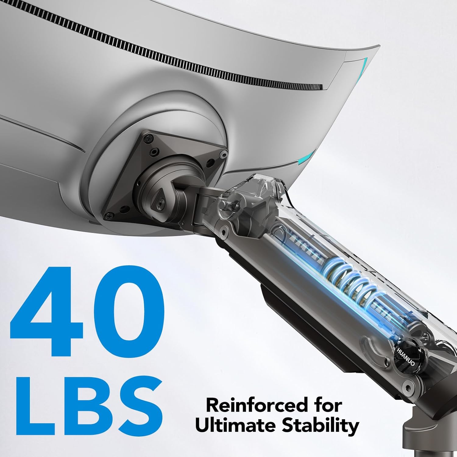 - Durable and Dependable: This HUANUO dual monitor arm is constructed in high-strength aluminum alloy, and features a reinforced VESA head, lock ring, and 20% thicker arms for ultimate stability. Supporting monitors up to 40 lbs, it has passed rigorous testing, including 50,000 cycle motion tests and a 3X load test. So it'll keep your monitor securely in place for years.