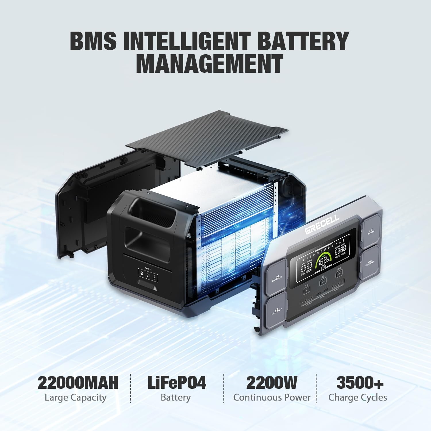 - 【Safe LiFePo4 Battery Pack】GRECELL portable power station 2200w uses industry-leading LiFePO4 batteries with a cycle life of up to 3500+ times. The built-in battery management system (BMS) provides up to 12 types of protection for the battery