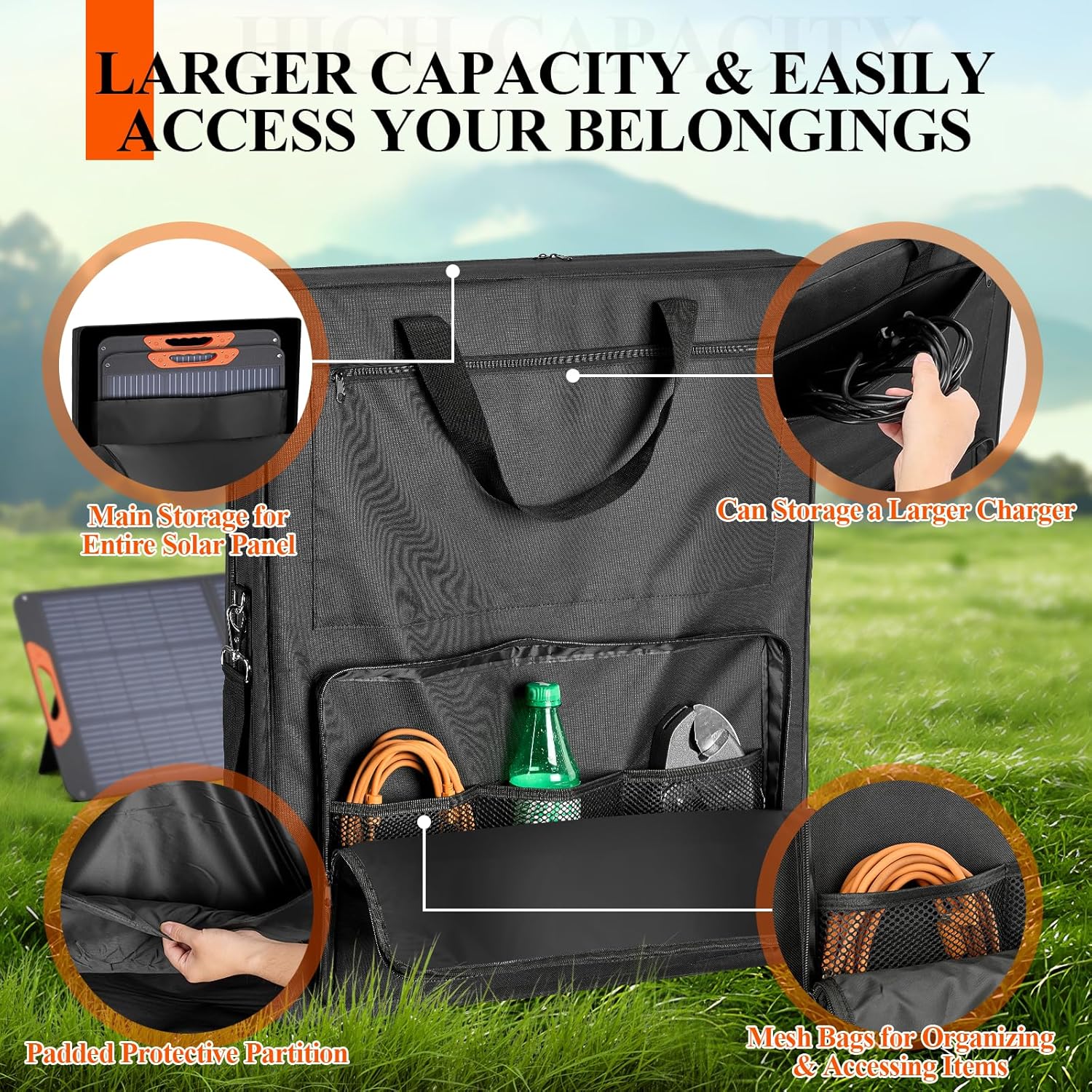 - 【ORGANIZED STORAGE & EXTRA POCKET】 - The main compartment can store 2 100W solar panels simultaneously or 1 200W,with a protective padded divider. Front zippered mesh pocket keeps your cables, connectors, and charger organized and no-tangle.