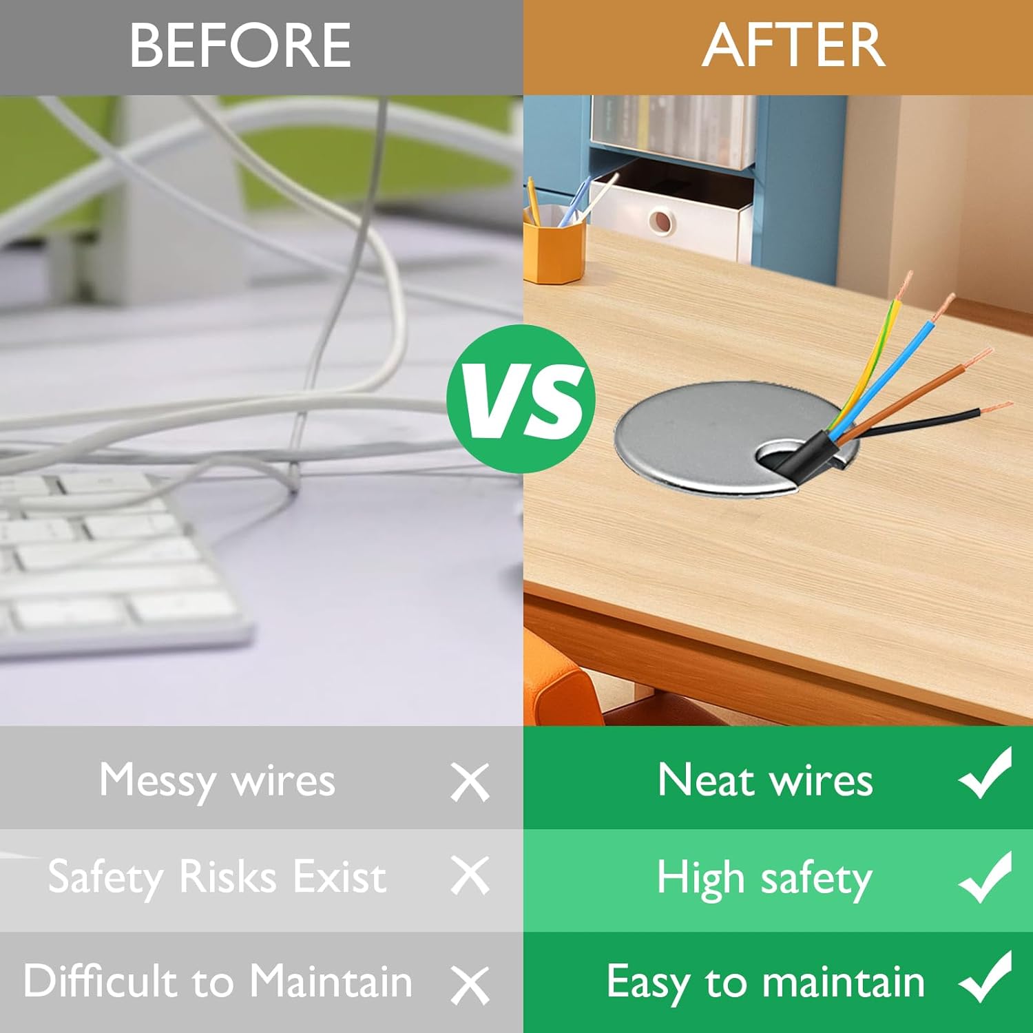 - PORTABLE STORAGE AND PROTECTION:The cord grommet can help to organize the cables on the desktop, which can keep the desktop tidy and improve the work efficiency; Reduces bending and pulling of cables, extends cable life and reduces safety hazards
